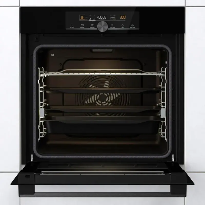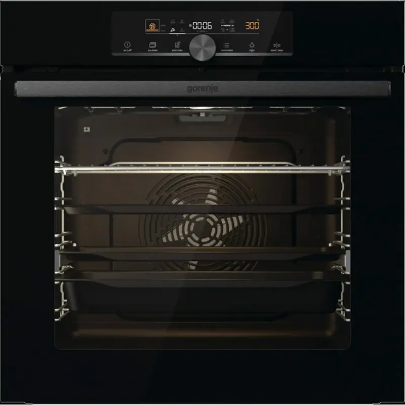 Мультифункциональный электрический духовой шкаф Gorenje BPS 6747 A06BG с пиролитической самоочисткой. Объем 77 л, черный цвет и полностью стеклянная панель управления с дисплеем IconTouch.