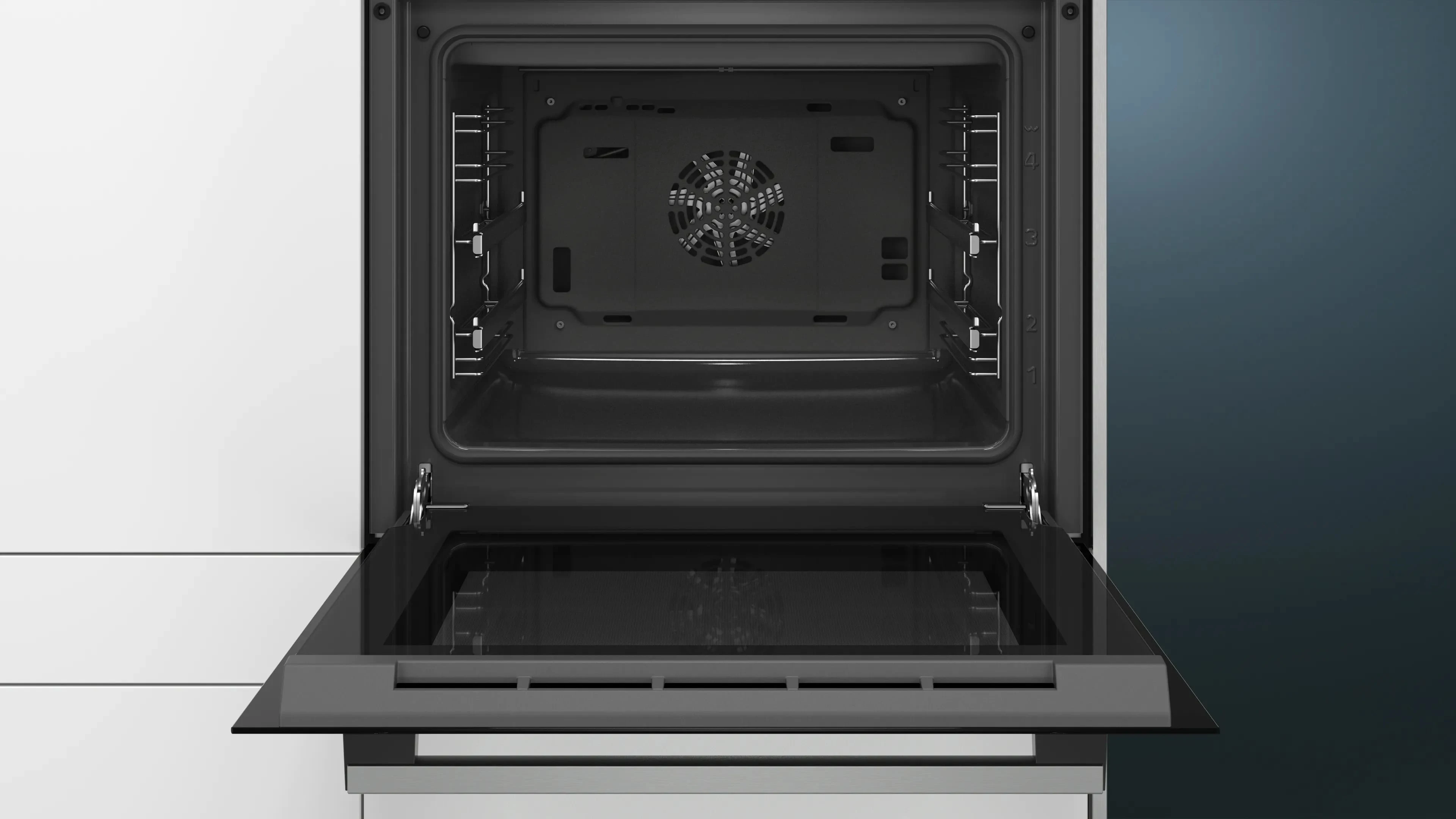 Електрична духова шафа Siemens HB557JYS5T з об’ємом 66 л та 8 режимами нагріву, включаючи 3D гаряче повітря plus, гриль, піца-режим та розморожування. Температурний діапазон 50°C - 275°C, 5 рівнів випікання з дворівневими телескопічними напрямними. Оснащена ecoClean Plus – спеціальним покриттям для автоматичного розщеплення жиру та легкого очищення. Має поворотний перемикач, скляну внутрішню поверхню дверцят, електронний годинник, швидке розігрівання, вентилятор охолодження та внутрішнє освітлення. Захисне відключення забезпечує безпеку.