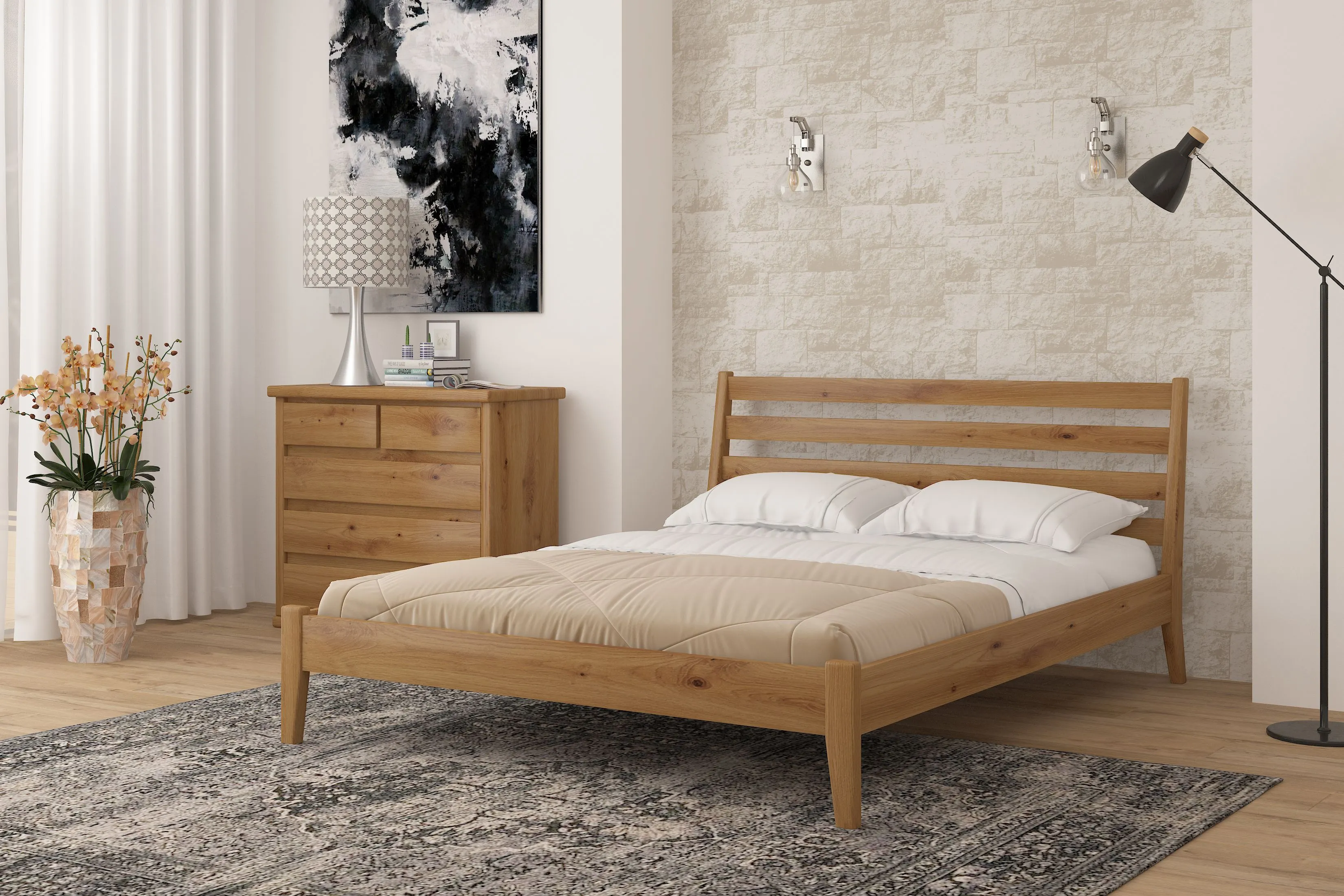 Дерев’яне ліжко Mebigrand Челсі Ліжко «Челсі» від Mebigrand - це стильна і практична модель із сучасним дизайном. Каркас виконано з якісного масиву дерева, що забезпечує міцність і довговічність. Різноманітність колірних рішень дозволяє легко вписати ліжко в будь-який інтер'єр. Ортопедична основа забезпечує здоровий і комфортний сон. Каркас ліжка - масив Сосна Ліжко з масиву сосни має безліч переваг: Сосна - це екологічно чистий матеріал, який не виділяє шкідливих речовин і безпечний для здоров'я. Вироби з сосни вирізняються міцністю і довговічністю завдяки високій щільності деревини, що гарантує довгий термін служби.Ліжка з сосни, як правило, менш схильні до деформації і впливу часу, що зберігає їхній привабливий зовнішній вигляд протягом багатьох років. Ще одна перевага масиву - за ним дуже легко доглядати. Ліжко можна просто протерти сухою тканиною або вологою. Ліжко «Челсі» можна замовити в таких відтінках і фарбах Покриття фарба Покриття ліжка фарбою відіграє важливу роль у його зовнішньому вигляді та довговічності. Ліжко з масиву сосни, вкрите якісною фарбою, не тільки набуває естетично привабливого вигляду, а й захищене від негативних зовнішніх впливів, таких як волога, пил і ультрафіолетові промені. Фарба також допомагає зберегти природну текстуру деревини, підкреслюючи її візерунки і надаючи поверхні рівний і гладкий фініш. Крім того, покриття фарбою дає змогу легко підібрати колір ліжка під будь-який інтер'єр. Покриття лак Покриття лаком ліжка з дерева не тільки захищає його від зовнішніх впливів, таких як волога, пил і механічні пошкодження, а й значно покращує його зовнішній вигляд. Гладка поверхня з легким блиском надає ліжку вишуканості, зберігаючи при цьому його натуральну красу. Крім того, лак дає змогу дереву «дихати», що зберігає його екологічні властивості та робить ліжко безпечним для здоров'я. Ортопедичні ламелі Базова комплектація включає ламельну основу з відстанню між ламелями 5,5 см, що є оптимальним для надійної експлуатації більшості матраців. Як додатковий варіант пропонується Посилені ламелі, з відстанню між ламелями 3 см. Ламельна основа 3 см, ідеально підходить для матраців з незалежним пружинним блоком, забезпечуючи: Більш посилену підтримку матраца Більш жорстке і комфортне спальне місце Відповідність додатковим вимогам виробників матраців для дотримання гарантійних умов Цей варіант основи гарантує надійність і довговічність вашого матраца. Приклад складання аналогічного ліжка фабрики Мебігранд Характеристики Каркас: Сосна Спальне місце: 140х200 Висота узголів'я (мм): 950 Висота узніжжя (мм): 360 Ширина (мм): 1480 Довжина (мм): 2190 Колір: Горіх світлий Покриття:Лак