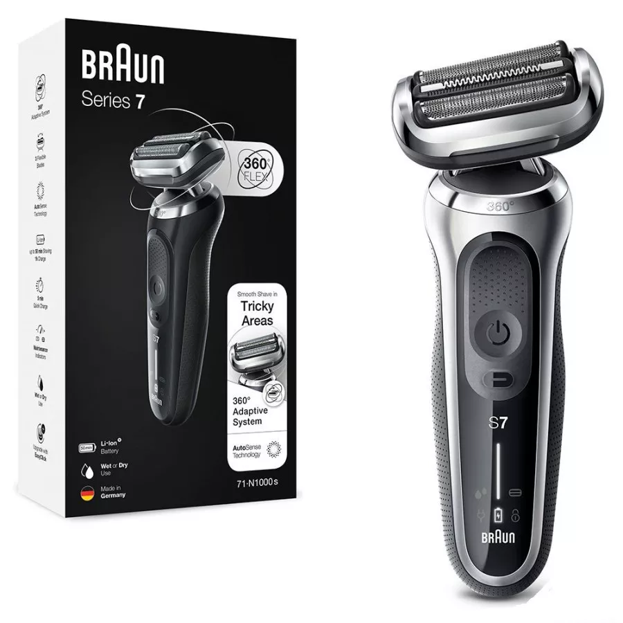 Braun Series 7 71-S1000s SILVER / BLACK - електробритва забезпечує гладке гоління навіть у важкодоступних місцях завдяки голівці, що обертається на 360°. Ефективний навіть при жорсткій щетині: технологія AutoSense аналізує щетину та регулює потужність залежно від її густоти, захоплюючи та підрівнюючи більше волосся при кожному голінні.