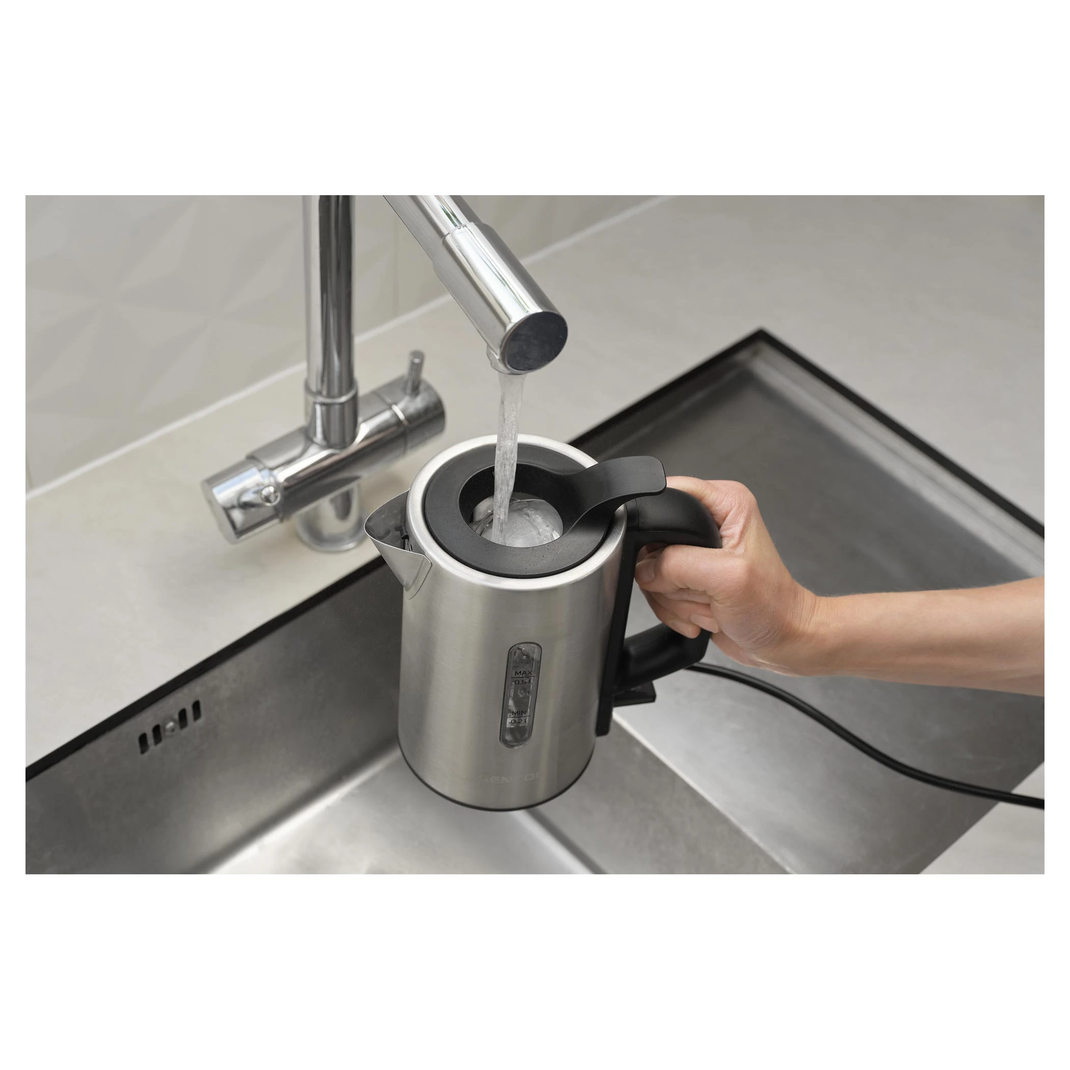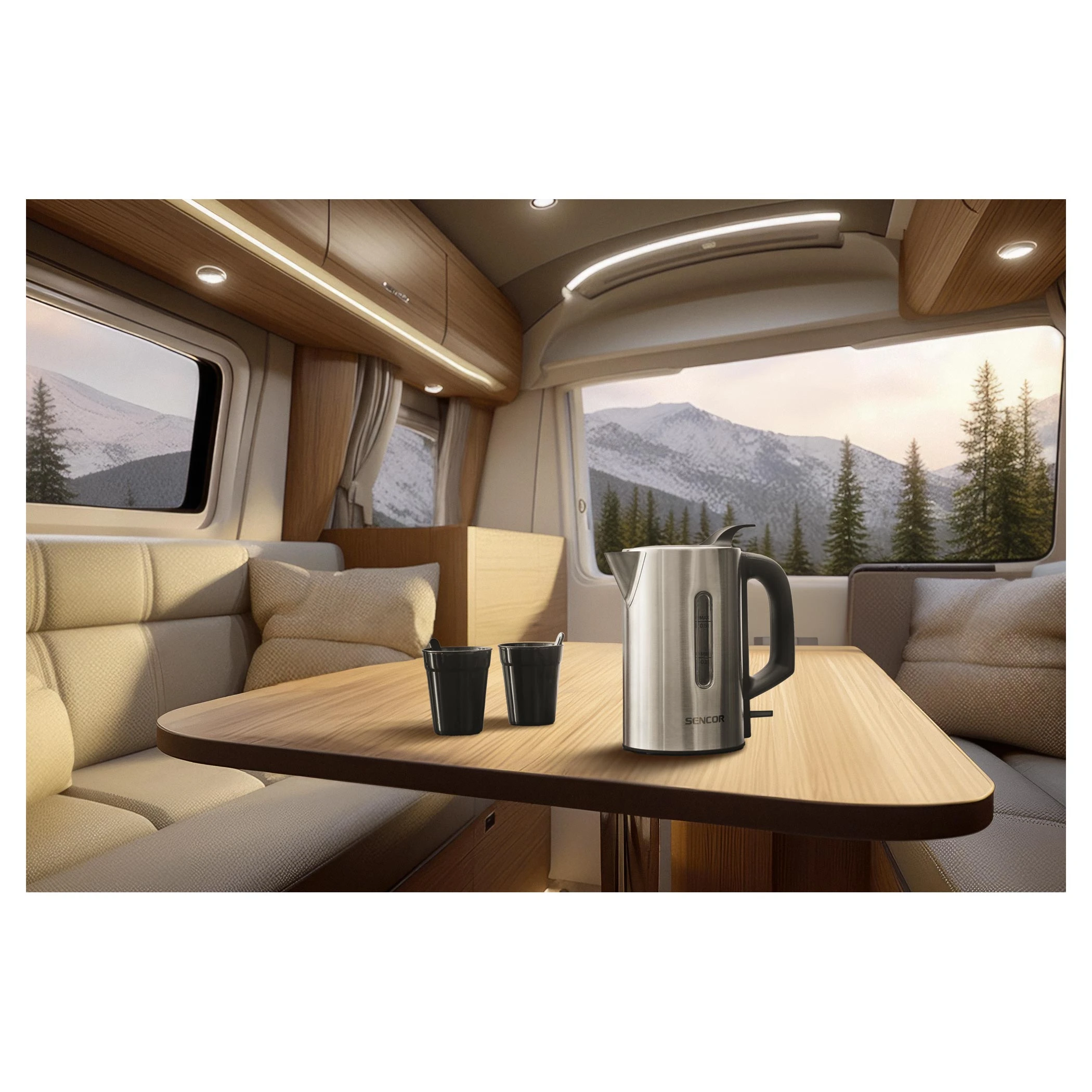 Sencor SWK170SS — ультракомпактний дорожній електрочайник 0,5 л з нержавіючої сталі та потужністю 1100 Вт. У комплекті 2 пластикові склянки + 2 ложки без BPA. Прихований нагрівач, подвійний захист (від сухого включення та перегріву), знімний фільтр від накипу, віконце рівня води та відсік для кабелю. Ідеальний для подорожей, кемпінгу, офісу чи маленької кухні.