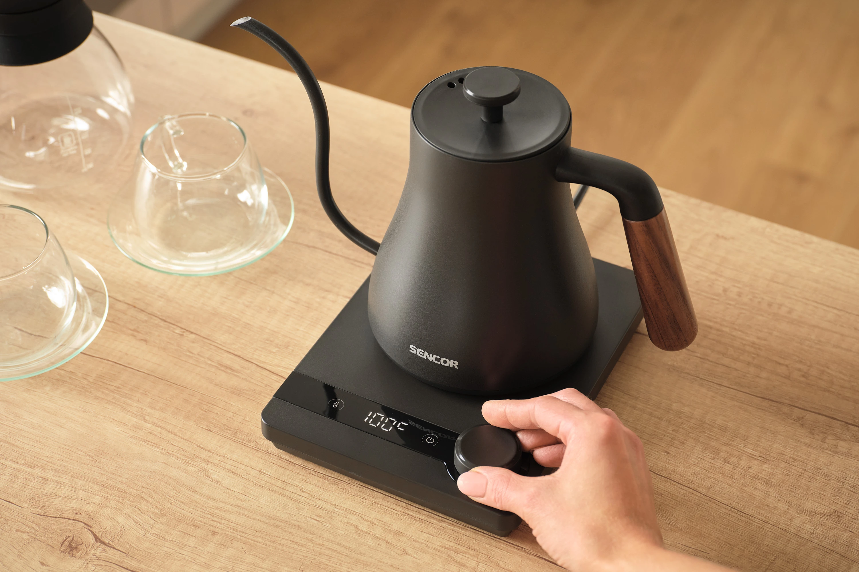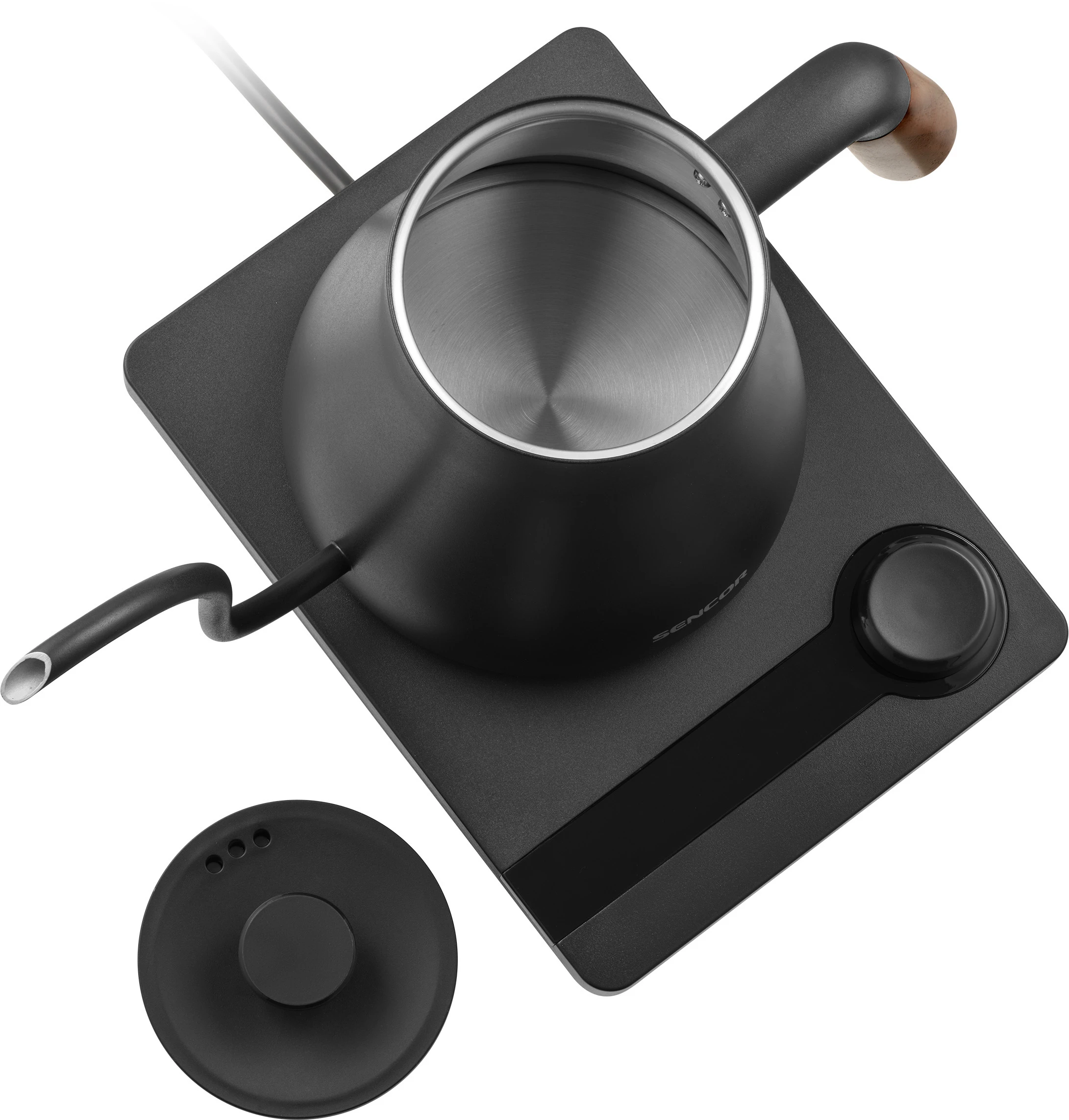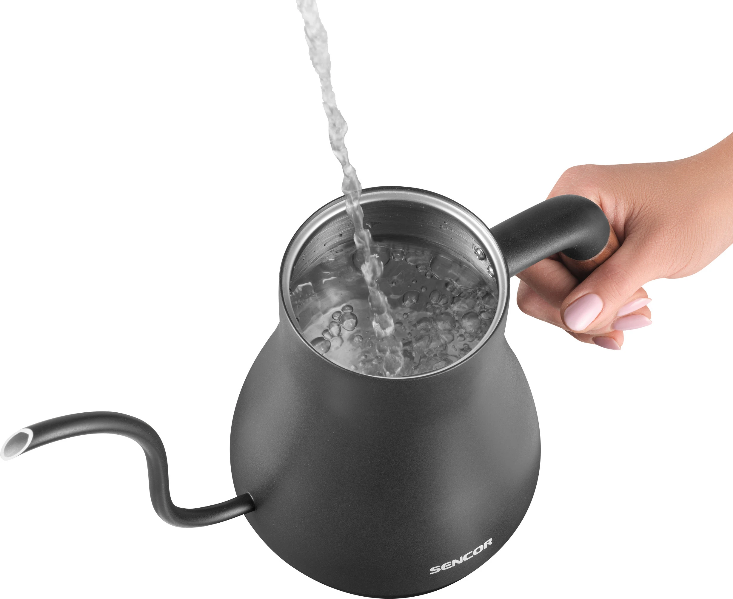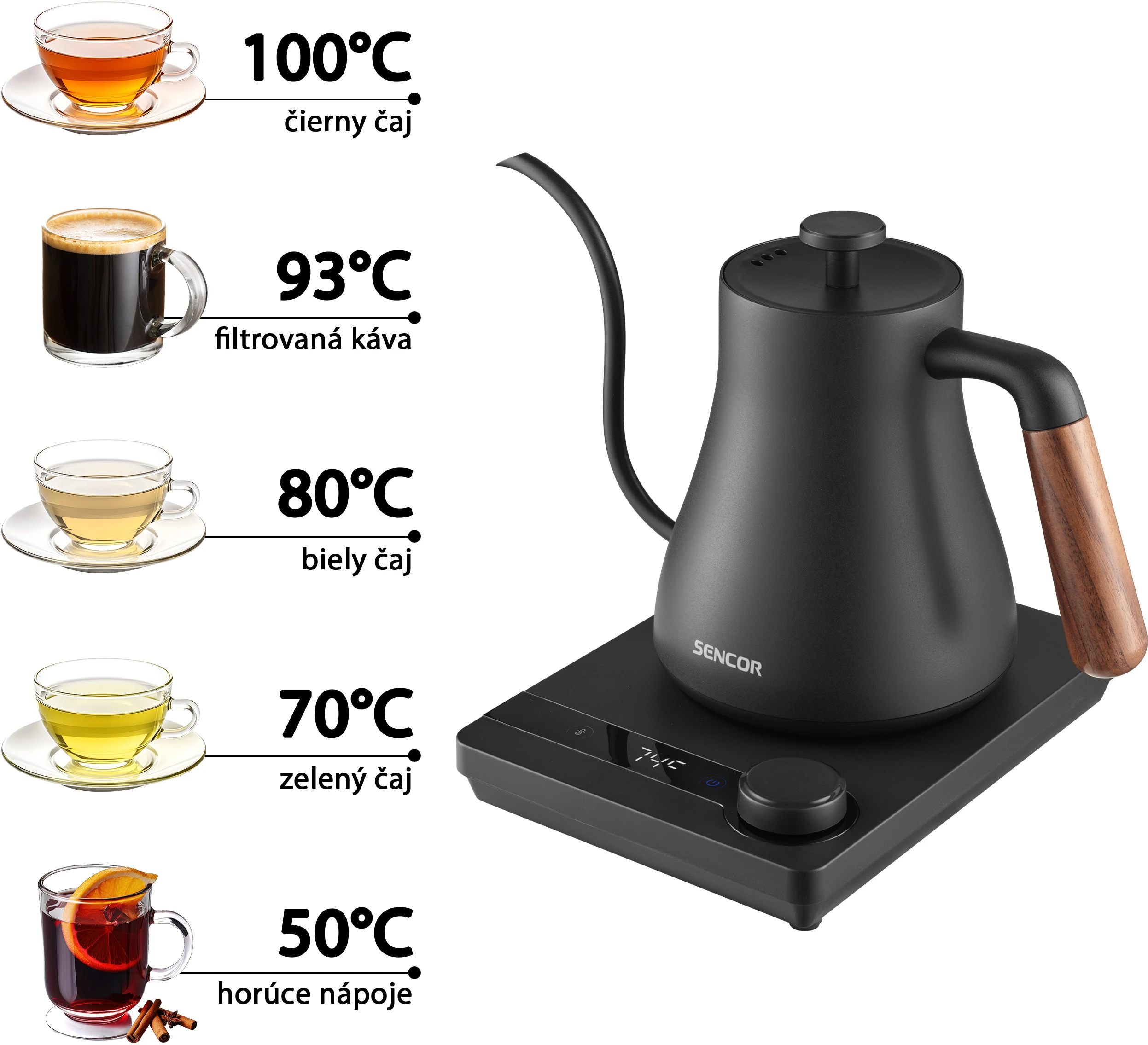 Електрочайник Sencor SWK2828BK об'ємом 0,6 л з носиком «гусяча шийка» — інструмент для точного заварювання чаю та фільтрованої кави в домашніх умовах. П'ять температурних режимів і підтримання тепла протягом двох годин дають змогу щоразу отримувати напій потрібної температури. Корпус з нержавіючої сталі SUS304 і дерев'яна ручка забезпечують довговічність і комфорт під час використання. Прихований нагрівальний елемент 1000 Вт і роз'єм STRIX 360° гарантують швидке нагрівання та безпечну роботу.