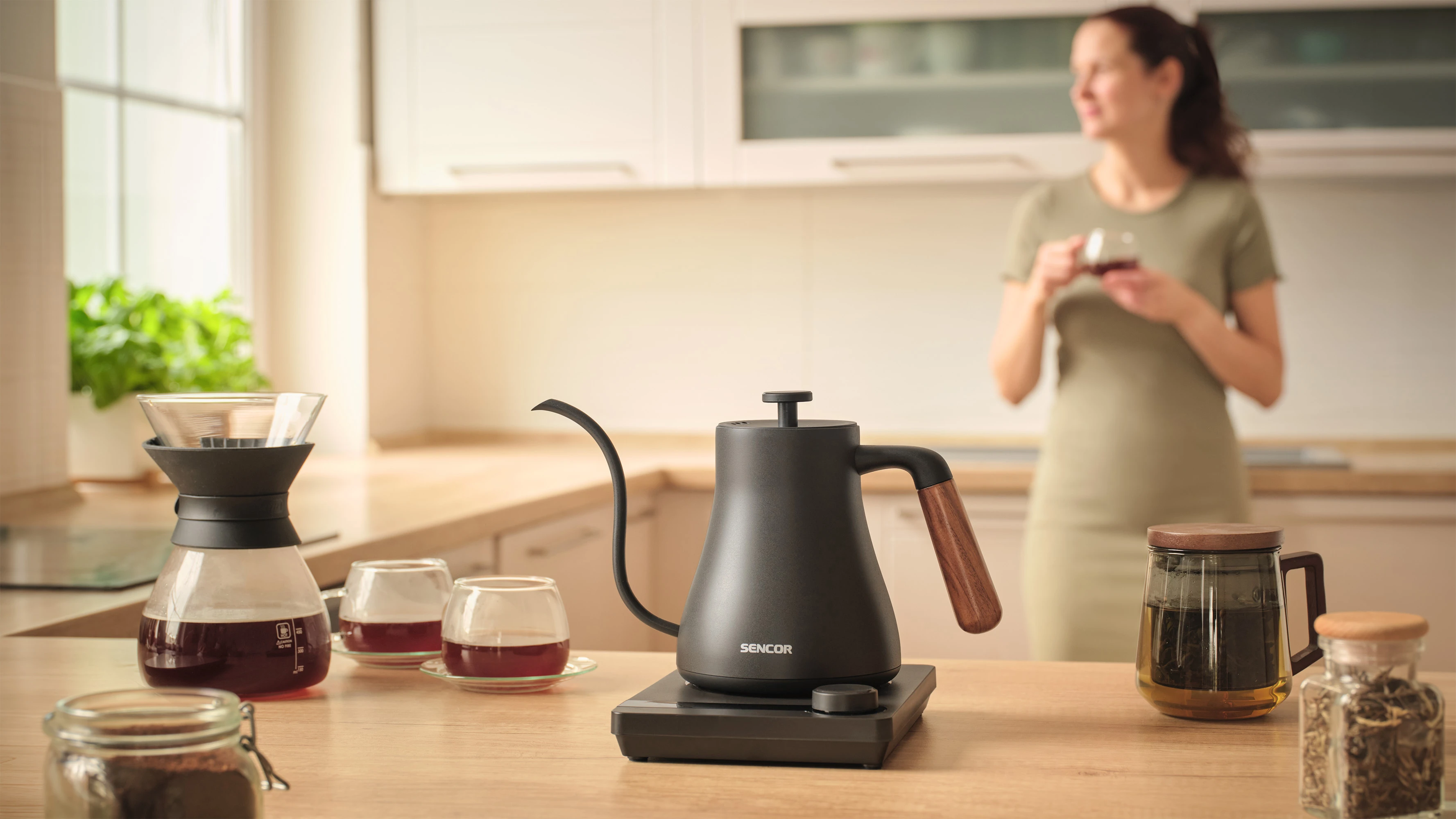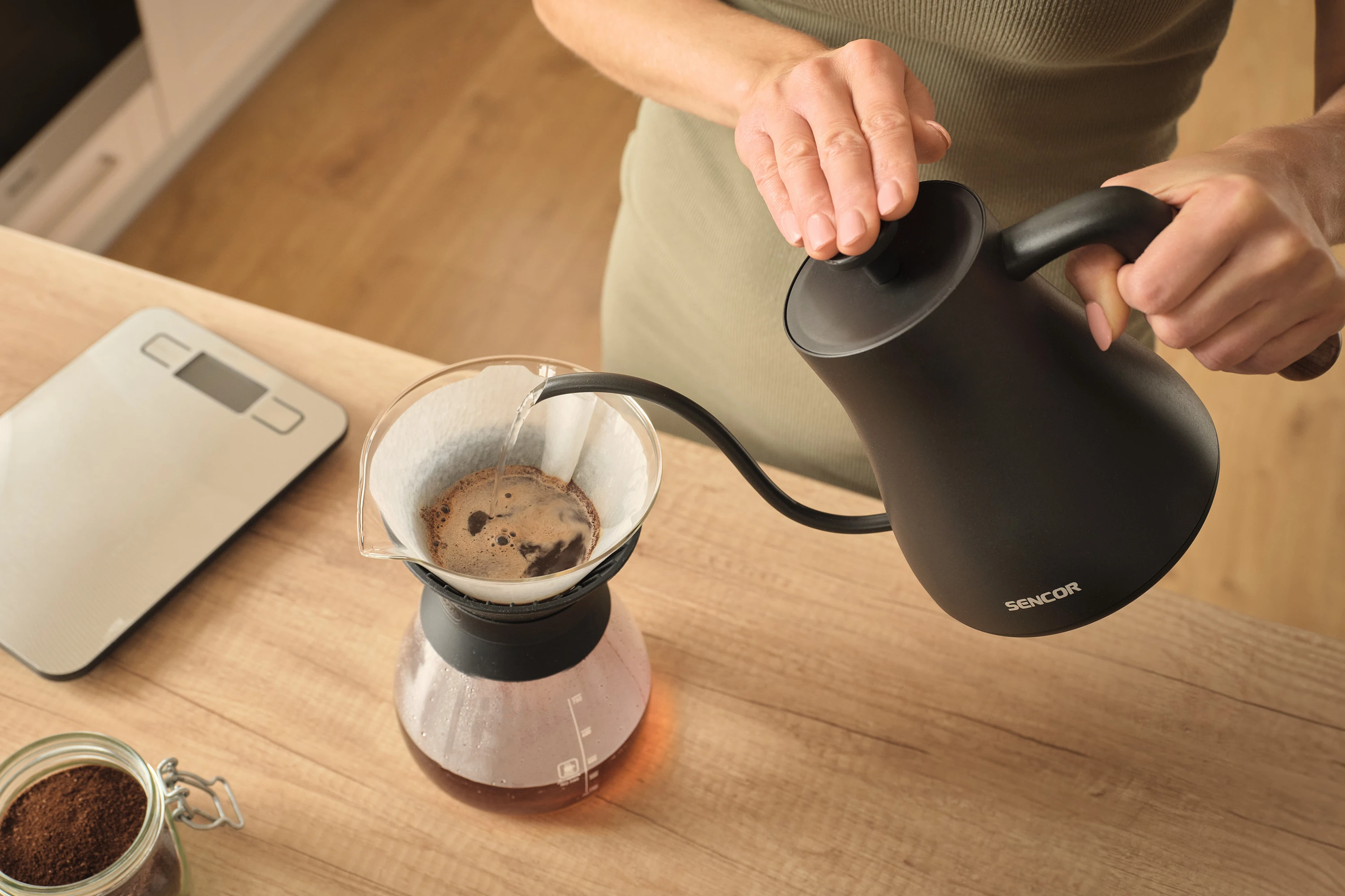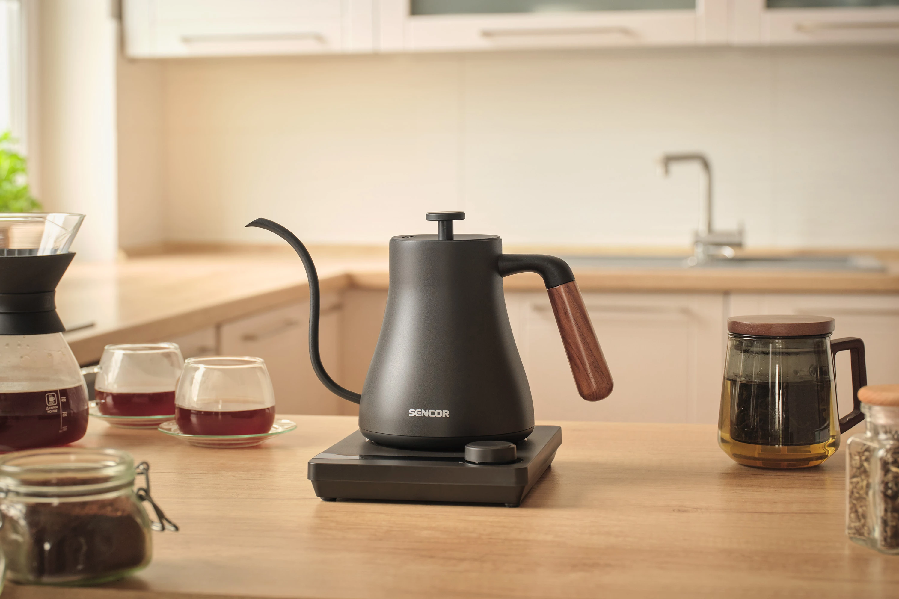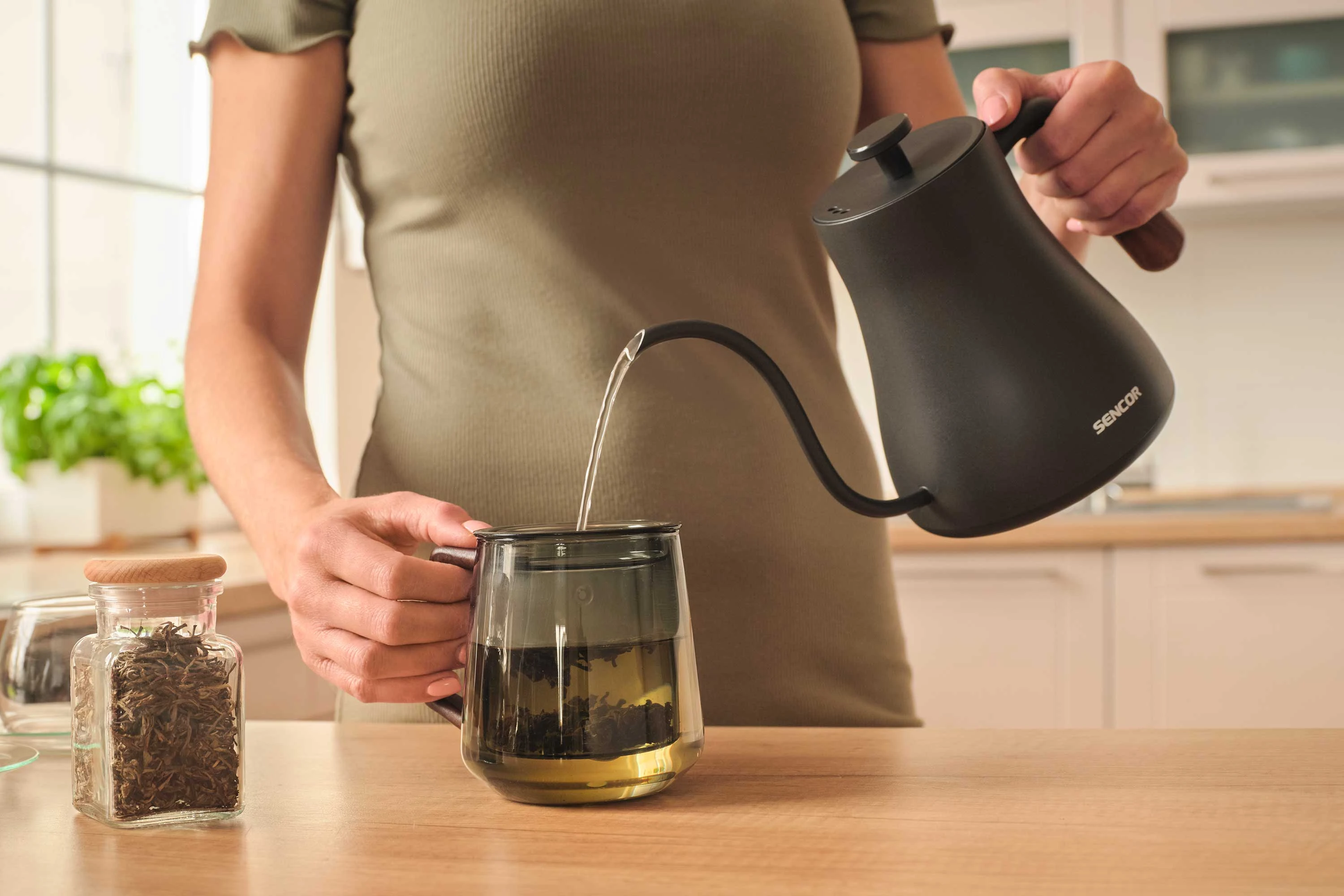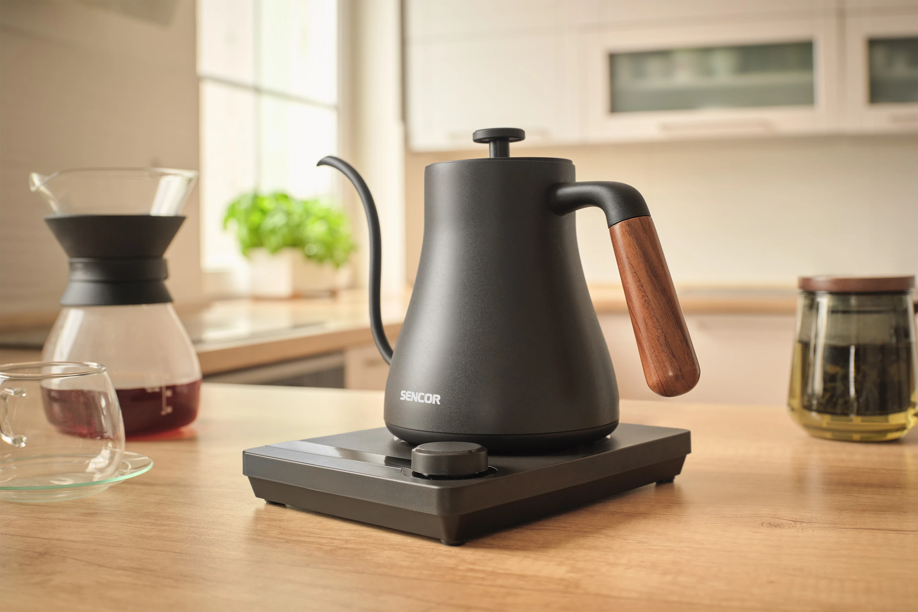 Електрочайник Sencor SWK2828BK об'ємом 0,6 л з носиком «гусяча шийка» — інструмент для точного заварювання чаю та фільтрованої кави в домашніх умовах. П'ять температурних режимів і підтримання тепла протягом двох годин дають змогу щоразу отримувати напій потрібної температури. Корпус з нержавіючої сталі SUS304 і дерев'яна ручка забезпечують довговічність і комфорт під час використання. Прихований нагрівальний елемент 1000 Вт і роз'єм STRIX 360° гарантують швидке нагрівання та безпечну роботу.