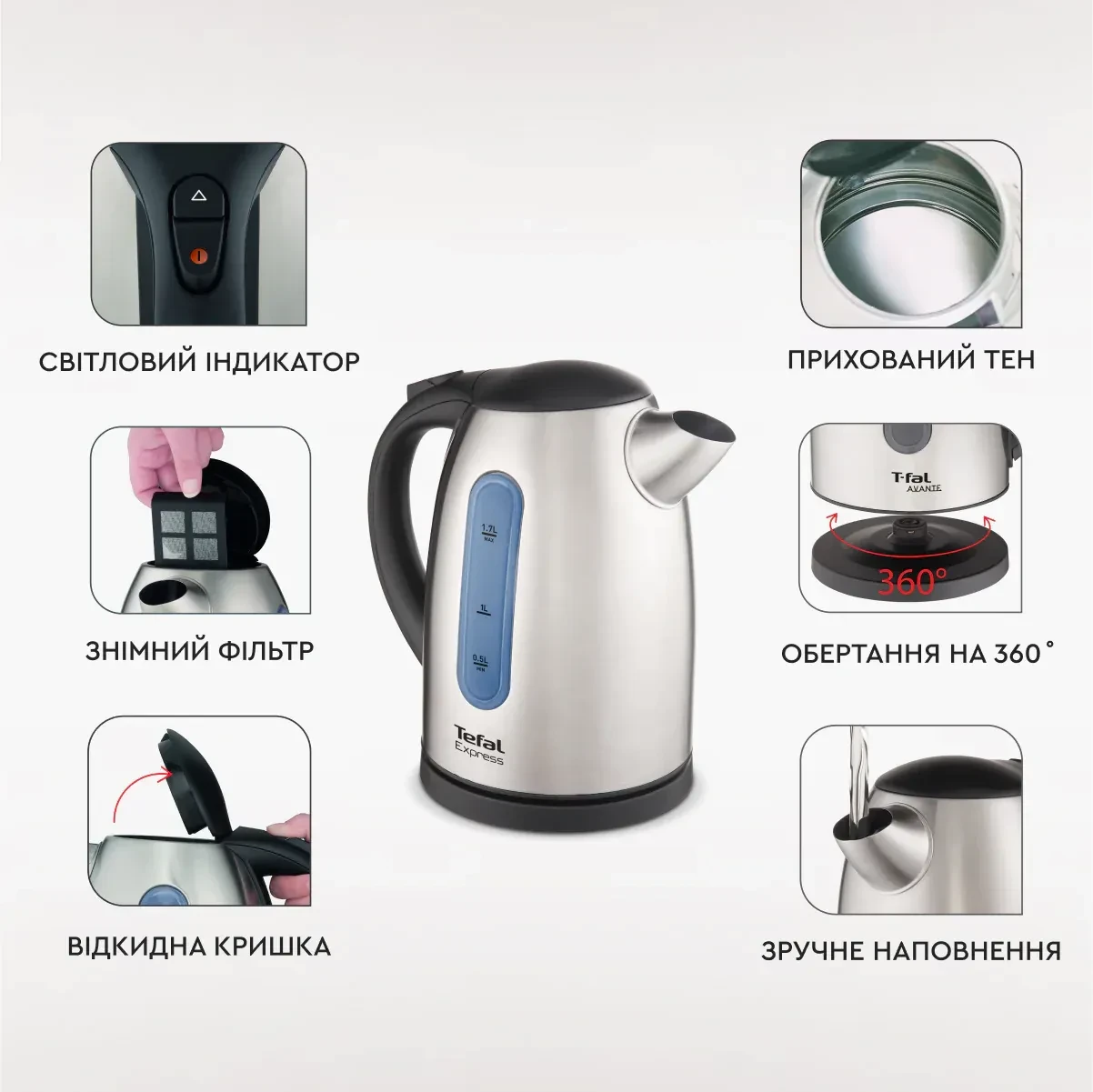 - Особенности Обертання на 360 °; Відкидна кришка; світловий індикатор; Знімний фільтр від накипу;