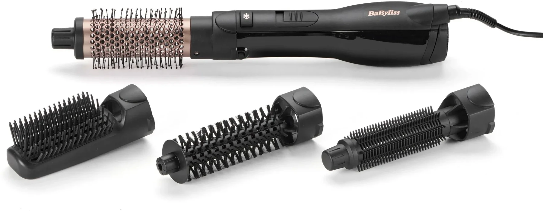 Фен-щітка Babyliss Smooth Finish AS122E — універсальний стайлінг-прилад потужністю 1200 Вт із керамічним покриттям, іонізацією та 4 насадками: конусною, гребінцем, щіткою з пластиковими зубчиками та щіткою зі штучною щетиною. Має 3 температурні режими, холодне повітря для фіксації укладки та обертальний шнур 2,2 м.