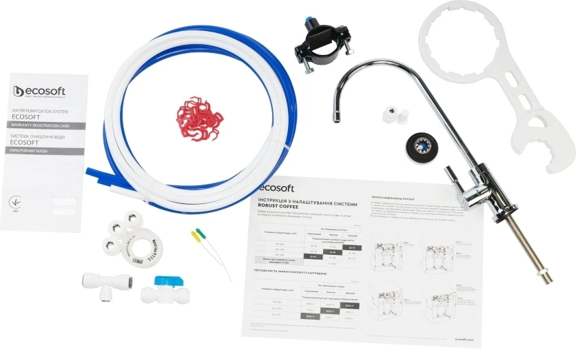 - Комплектация інструкція; фільтр очищення води RObust COFFEE; кран для очищеної води; комплект підключень; ключі д