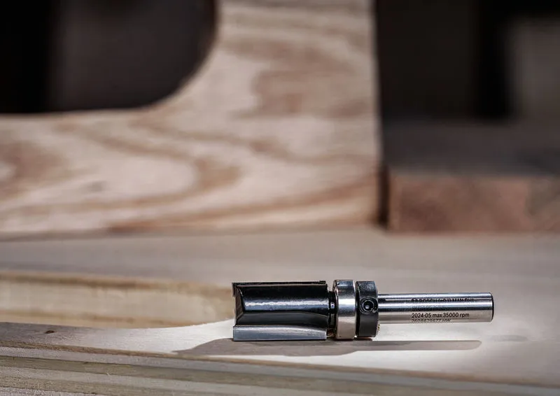 Фреза с хвостовиком 8 мм имеет диаметр 12,7 мм, общую длину 68 мм, рабочую — 25,4 мм. Изготовлена из твердого сплава, с двумя лезвиями и шарикоподшипником, фреза предназначена для выборки заподлицо и снятия фасок древесных, абразивных листовых материалов. Удобна для работы с окантовочными планками, например при производстве мебели, изготовлении ящиков. Шарикоподшипник помогает точно вести по заготовке без шаблона.