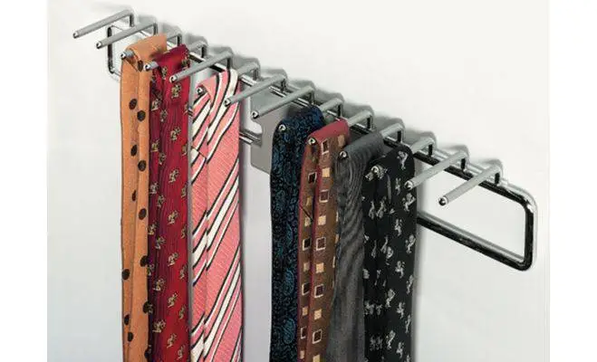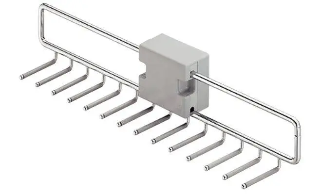 Тримач для краваток, з повзунком і проміжним елементом для компенсації виступу двері з не слизькими держателями. Виготовлений із сталі з хромованим покриттям. Колір сріблястий. Розмір 74 x 455 x 87 мм. Для 14 краваток.