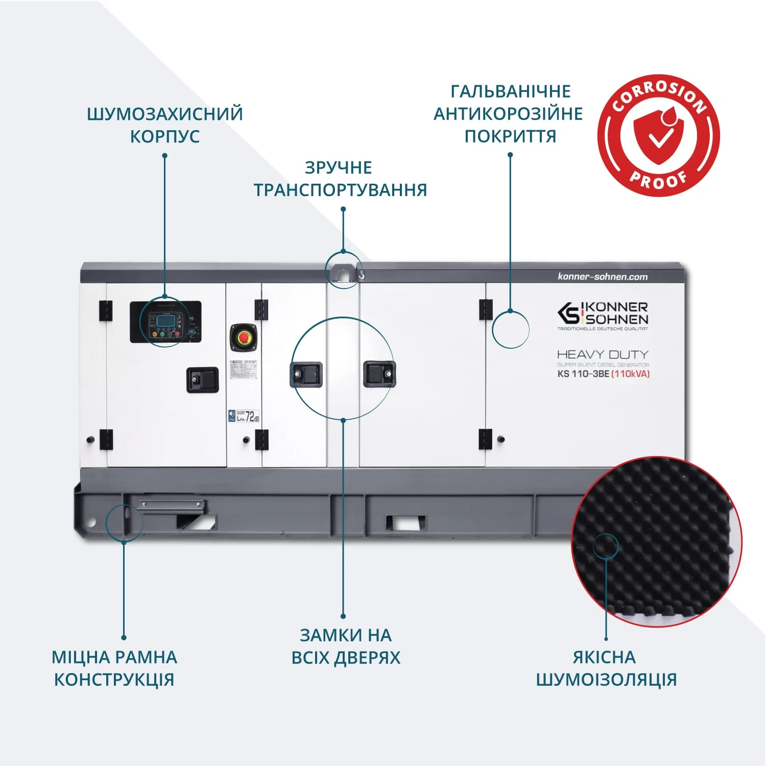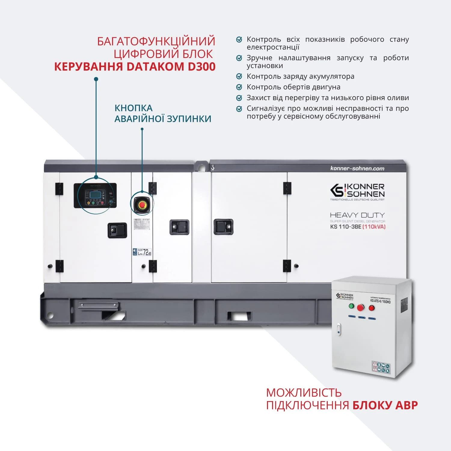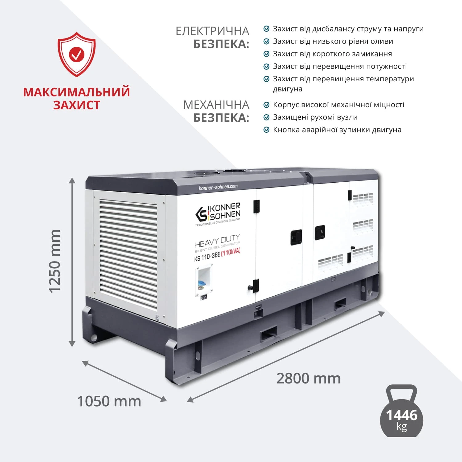Дизельний генератор Könner & Söhnen KS 110-3BE належить до серії HEAVY DUTY та призначений для трифазного електропостачання 230/400 В. Силова установка побудована на низькообертовому двигуні Baudouin з рідинним охолодженням. Передстартовий підігрів і електростартер забезпечують стабільний запуск за різних температурних умов. Шумозахисний всепогодний кожух дозволяє експлуатацію на промислових та інфраструктурних об’єктах.