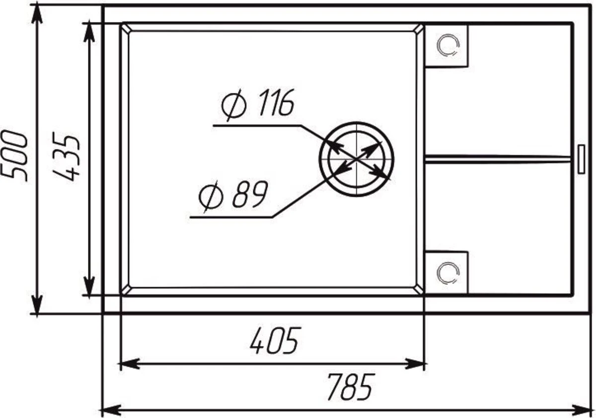 Мойка имеет просторные размеры (ШхГхВ: 790×500×200 мм) и глубокую основную чашу (ШхГхВ: 490×440х200 мм). Это обеспечивает комфортное мытье даже крупной посуды.