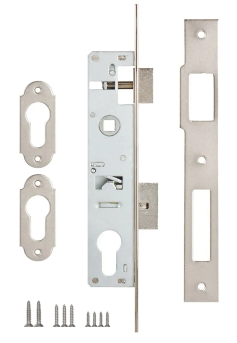 Совместим с нажимными ручками и цилиндрами при необходимости запирания на ключ. Подходит для дверных коробок, рассчитанных на язычок шириной 35 мм при backset 23 мм.