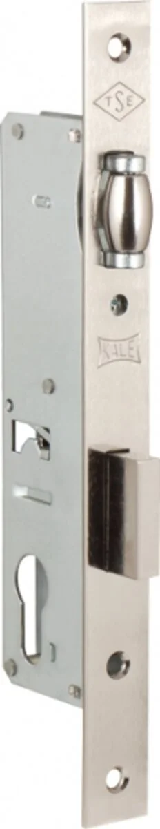 KALE ALU 155U-20 — врезной замок с роликовым фиксатором для алюминиевых и ПВХ дверей. Backset 23 мм и ролик шириной 20 мм обеспечивают тихое и мягкое притягивание полотна без защёлкивания. Поставляется в технической комплектации — без ответной планки, которую можно подобрать отдельно под конкретный профиль. Матовый никель повышает устойчивость к износу и коррозии.