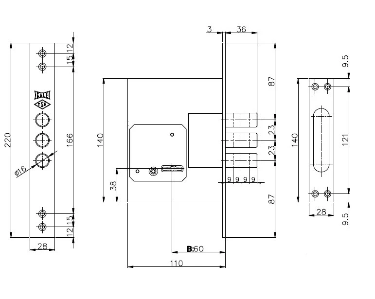- Габариты лицевой части замка 28х220 мм