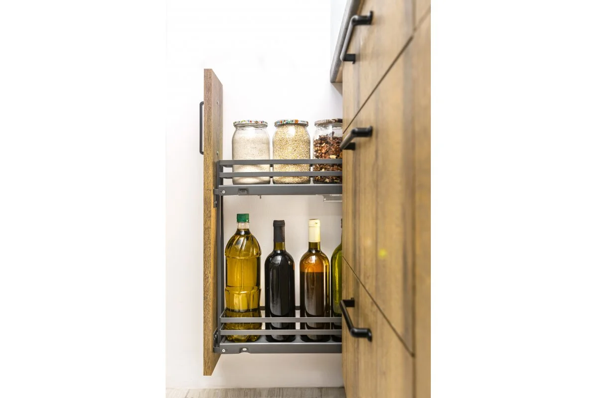Карго MOVIX может быть установлен с одной стороны в зависимости от выбора направляющих, которые не входят в комплект, для левостороннего монтажа: PB-KO450BO-E-L и для правого монтажа: PB-KO450BO-E-R. Крепления к стенкам кузова и к передней части шкафа обеспечивают устойчивость конструкции, а регулировка в трех плоскостях облегчает процесс сборки. Ширина грузовых корзин составляет 150 мм, что позволяет хранить бутылки с маслами, соками или уксусом. Цвет системы - хромированный, а круглые перила придают ей эстетичный вид.