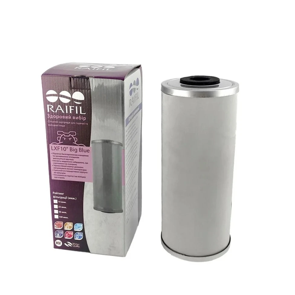 Картридж сітчастий Raifil LXF10-25 призначений для механічного очищення води від нерозчинних домішок. Виготовлений із нержавіючої сталі та має сітчасту структуру з тонкістю фільтрації 25 мкм. Орієнтований на багаторазове використання з можливістю очищення. Сумісний із корпусами стандарту Big Blue 10".