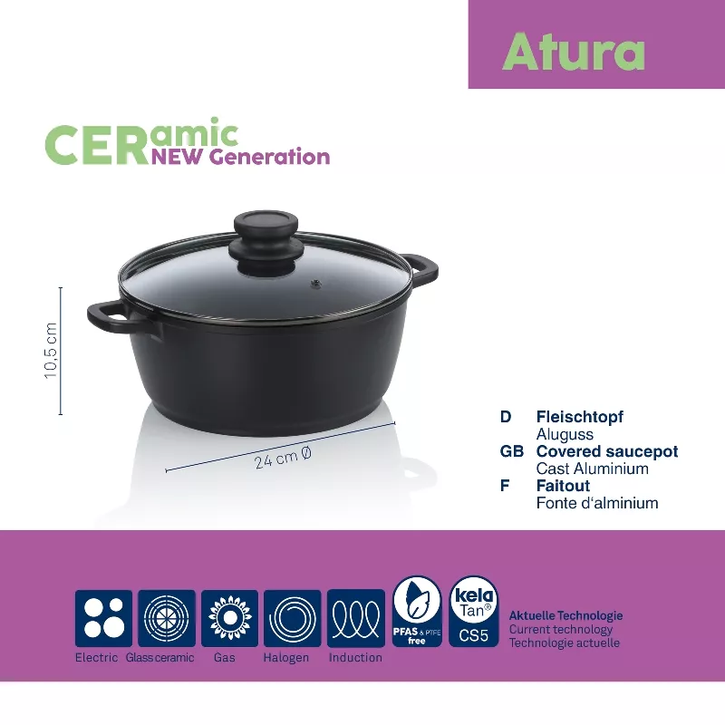 Керамічне покриття каструлі KELA Atura нового покоління без ПФАС (PFAS), термостійкість виробу до 250°C.