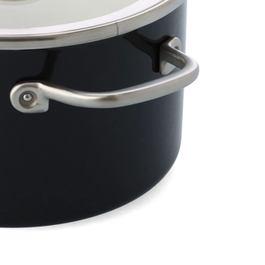 Кришка з жаростійкого скла має металевий обід і отвір для виходу пари. Вона щільно закриває каструлю, зберігає тепло та вологу, дозволяє контролювати процес приготування без відкривання.