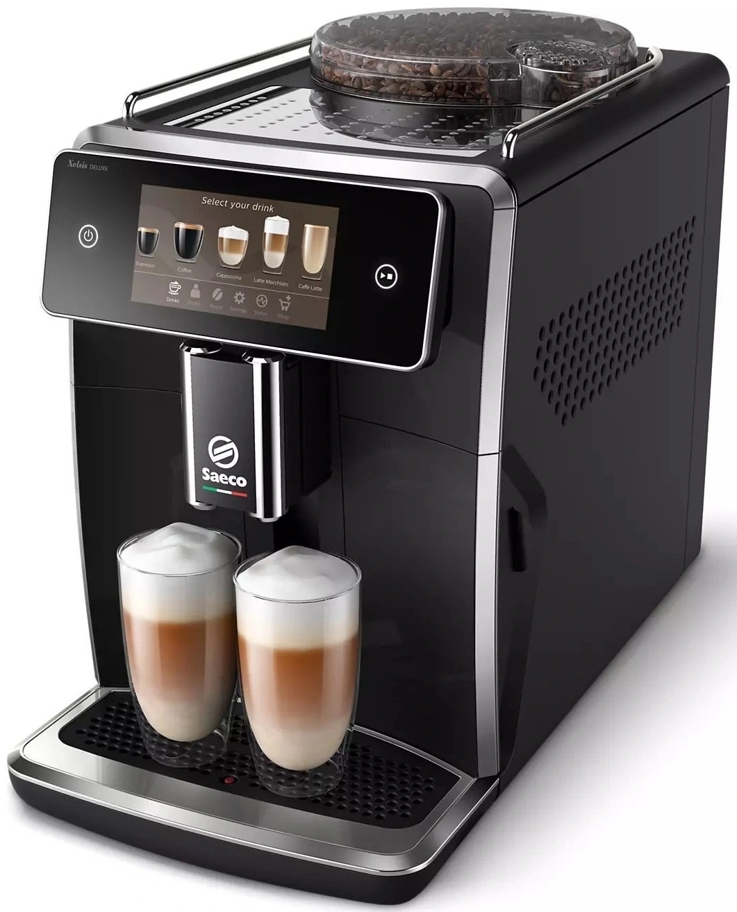 Кавомашина Saeco Xelsis Deluxe, 1,7л, зерно+мелена, автомат.капуч, авторецептів -22, чорний. 22 найвідоміших рецептів кави одним дотиком до кнопки BeanMaestro. Автоматично налаштовує параметри варильної групи для збереження аромату та смаку вибраних кавових зерен. Удосконалений 5-дюймовий кольоровий сенсорний дисплей для точного створення кавових напоїв. Вбудований модуль Wi-Fi для максимальної зручності у використанні та персональних рекомендацій щодо рецептів кави. Функція ExtraShot для подвійної інтенсивності кави. 3 налаштування смаку з CoffeeMaestro або налаштовуйте властивості кави за допомогою Coffee Equalizer на свій смак. LatteDuo: готуйте та насолоджуйтесь подвійними порціями будь-якого молочного кавового напою. LattePerfetto для густої та пишної молочної піни. Оптимальний баланс температури та аромату з Aroma Extract. 6 профілів: легко зберігайте бажані налаштування приготування. 20 000 чашок вишуканої кави з міцними керамічними жорнами. Великий герметичний контейнер для зерен, де вони залишаються свіжими. До 5000 чашок без очищення від накипу завдяки фільтру AquaClean.