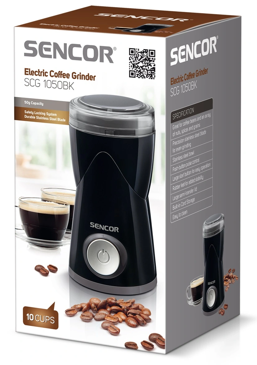 За допомогою кавомолки Sencor SCG 1050 потужністю 150 Вт надається можливість не тільки насолодитися відмінною кавою, а й ще подрібнювати волоські горіхи, злаки, насіння маку і спеції. Кавомолка компактна, легка в експлуатації, має стильний дизайн, корпус виконаний з міцного пластику. Це надійне кухонне обладнання прослужить протягом тривалого часу без найменших нарікань або неполадок.