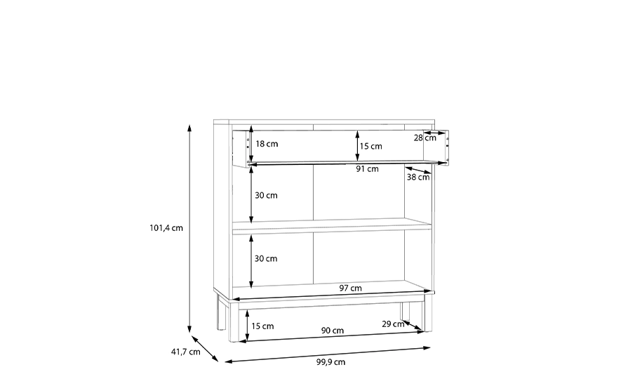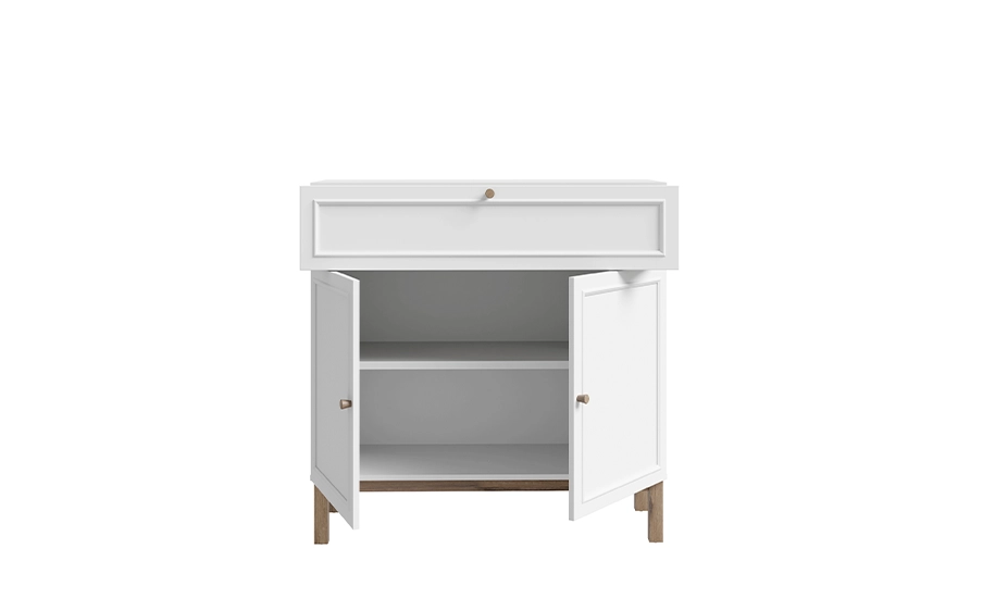 - Модель оснащена двома дверцятами та однією висувною шухлядою.