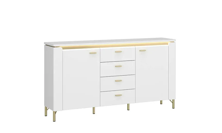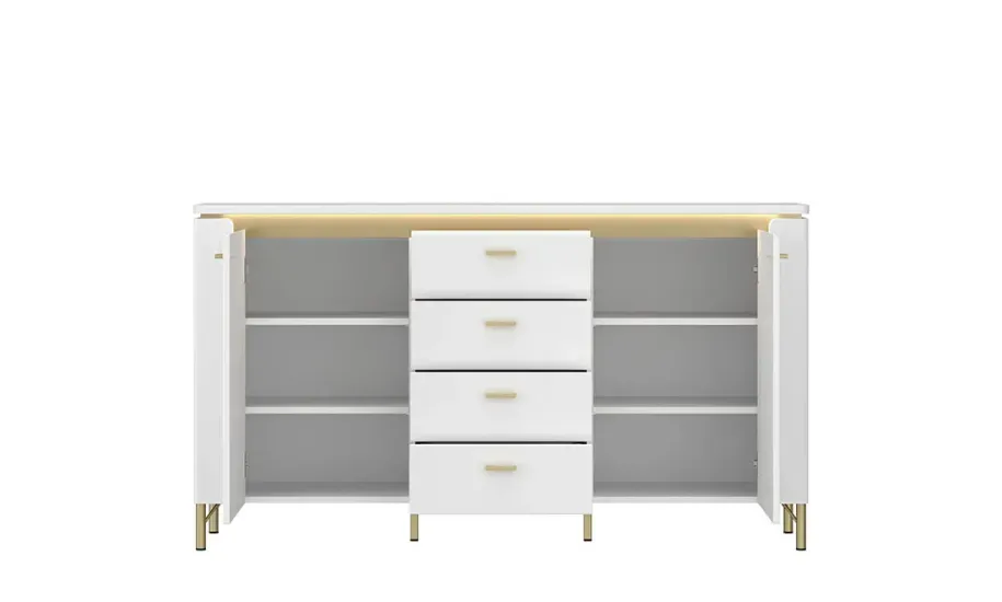 Комод Lazio – поєднання елегантності та практичності для сучасної вітальні чи їдальні. Глянцевий білий фасад, золотисті елементи та LED-підсвічування створюють розкішний візуальний ефект.