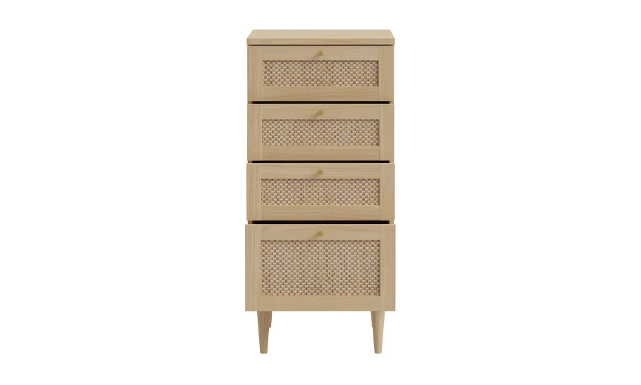 Чотири місткі шухляди забезпечують зручне зберігання одягу, білизни чи аксесуарів, залишаючи інтер’єр впорядкованим. Металеві ручки підкреслюють сучасний стиль, а ніжки з дерева додають конструкції стійкості та візуальної легкості.