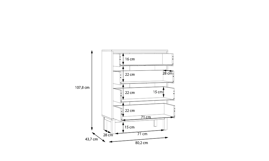 Стильний комод з чотирма висувними шухлядами — ідеальне рішення для організації зберігання в спальні, вітальні або передпокої. Лаконічний дизайн, поєднання сірого кольору з дерев’яними акцентами створюють сучасний образ.