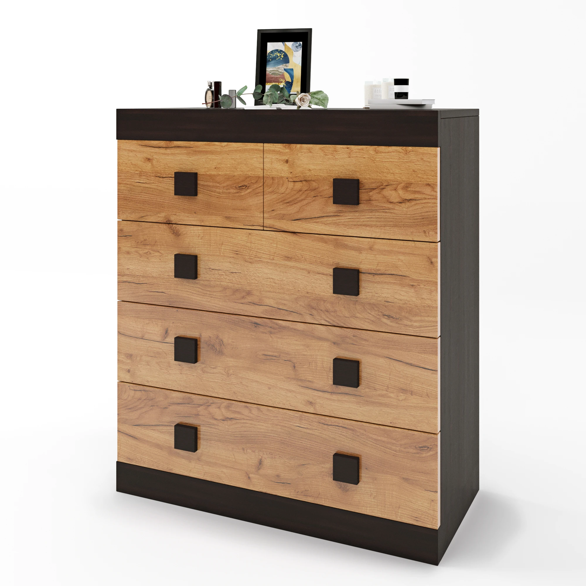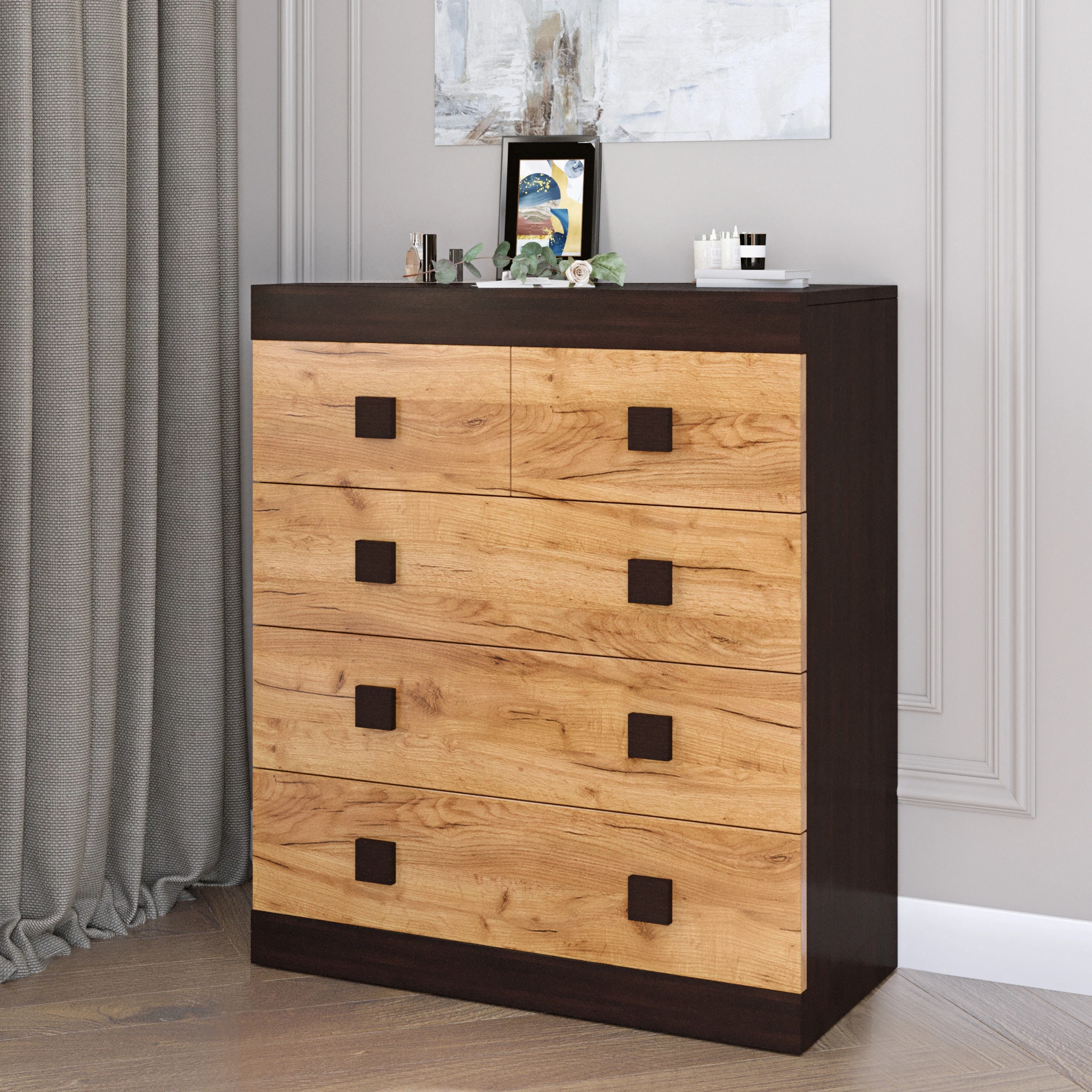 Шукаєте стильний та функціональний меблевий виріб для вашого інтер'єру? Комод Еверест на 5 ящиків — це поєднання елегантного дизайну та практичності. Його темний венге в комбінації з дубом крафт золотим додає сучасного вигляду будь-якій кімнаті, а достатня кількість ящиків забезпечує зручне зберігання ваших речей.