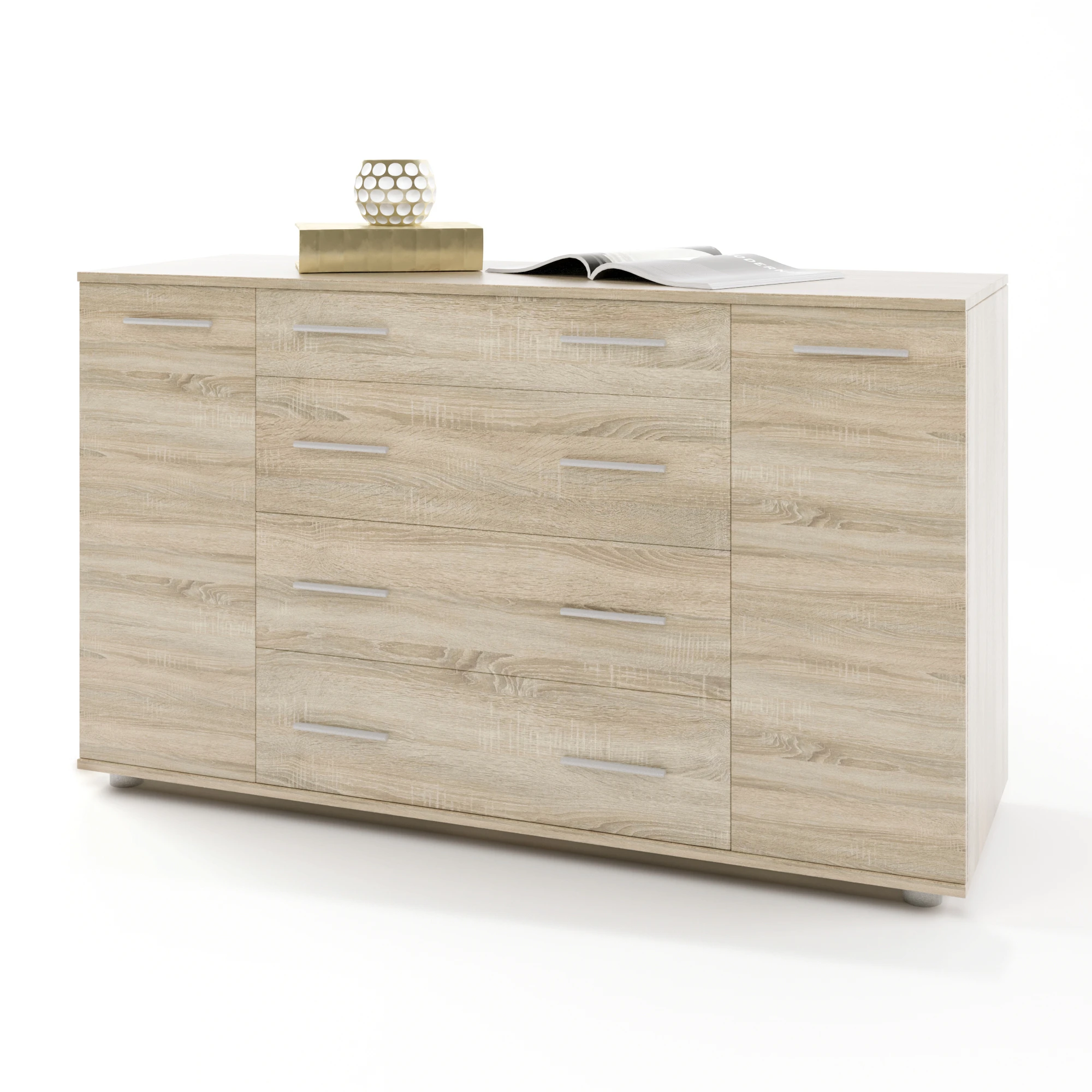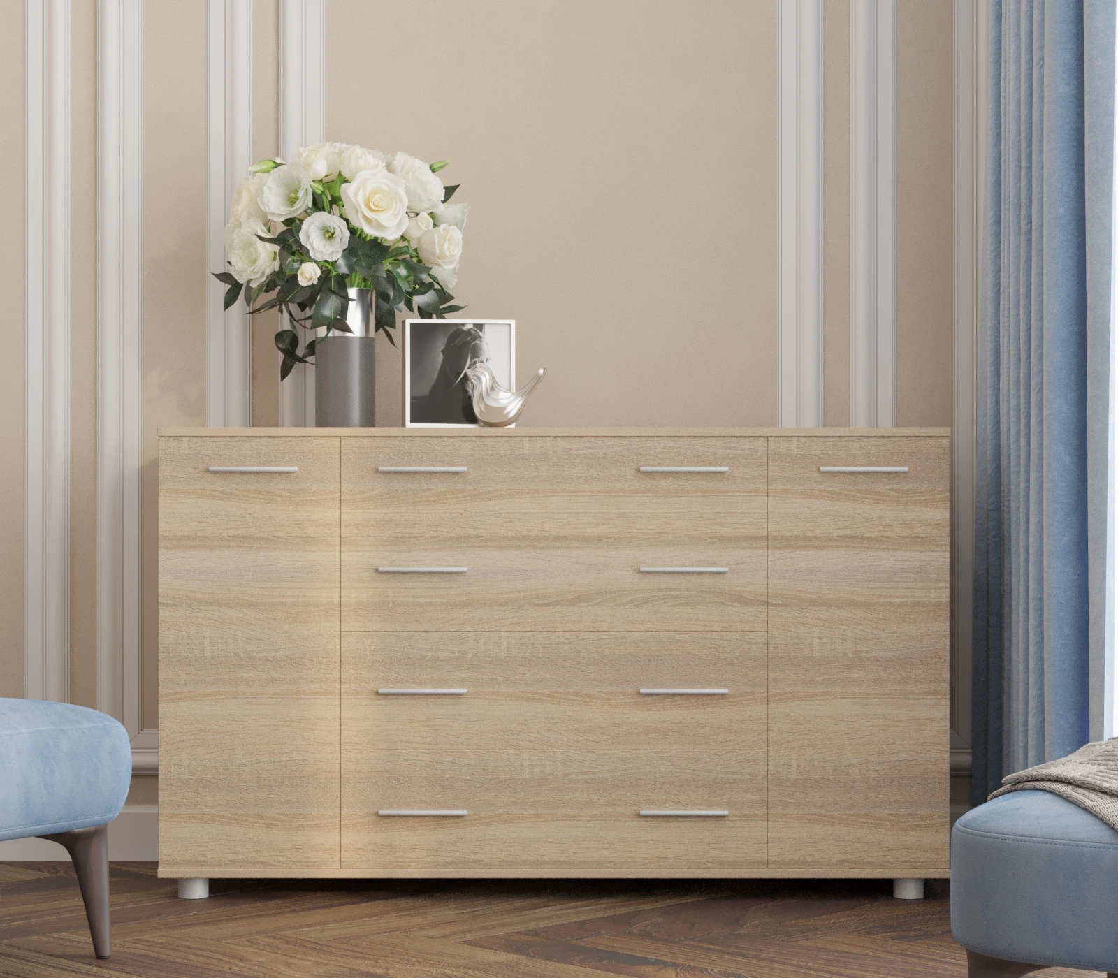 Завдяки чотирьом ящикам і двом дверцятам комод поєднує в собі функціональність і місткість. Використання якісної ламінованої ДСП від Swiss Krono та телескопічні напрямні забезпечують комфорт у щоденному користуванні та довговічність меблів.