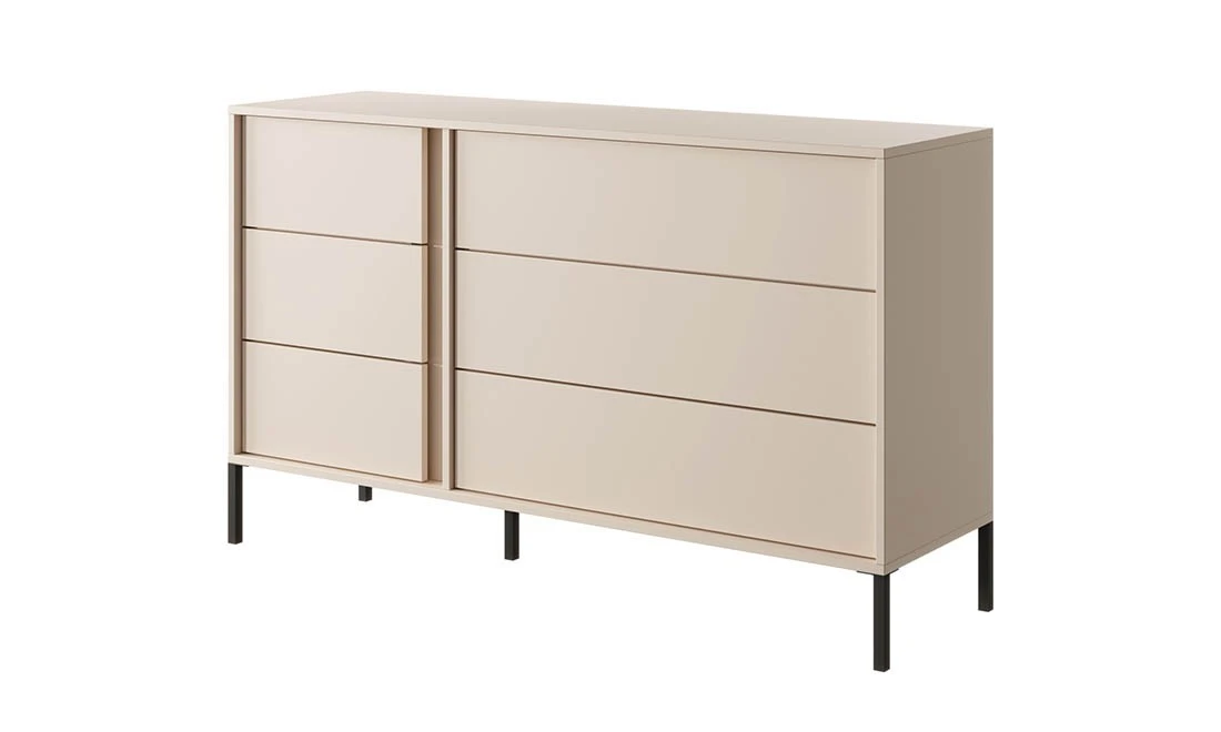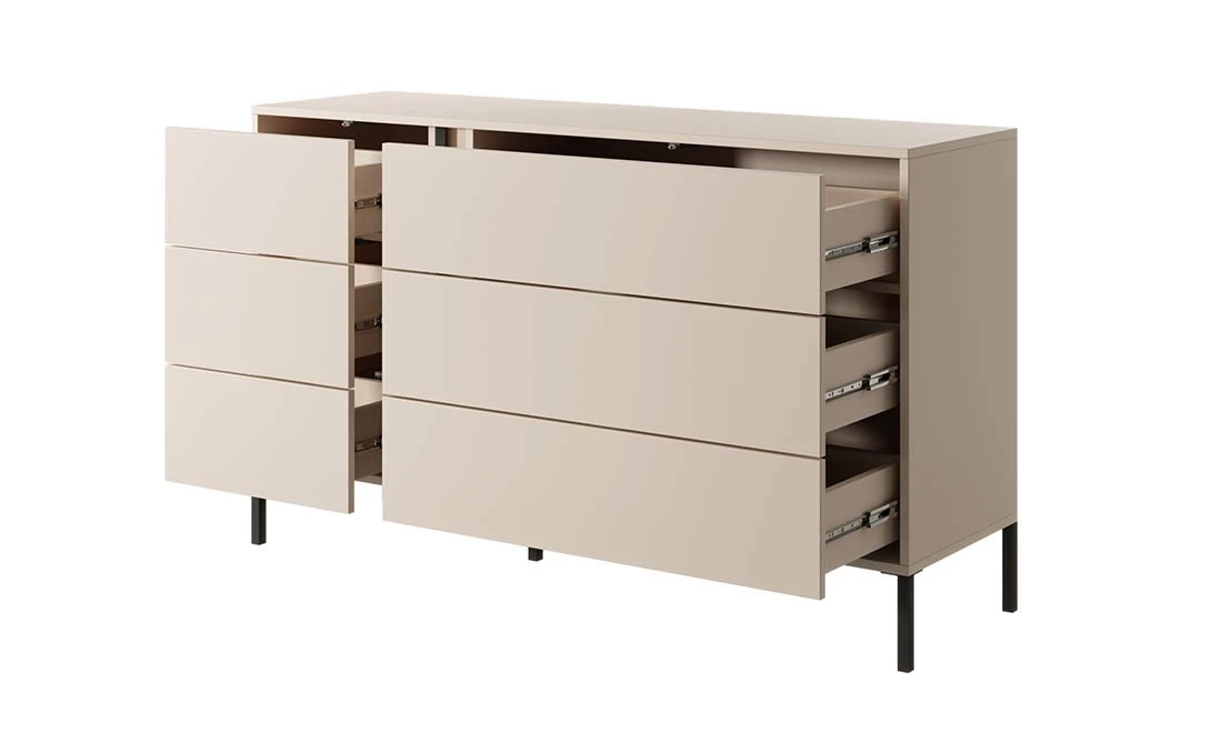 Корпус комода виготовлений з ламінованої ДСП, а крайка - з міцного ABS. Він оснащений сучасною системою відкриття push-to-open та механізмами телескопічного висування шухляд, які роблять користування ним дуже зручним.