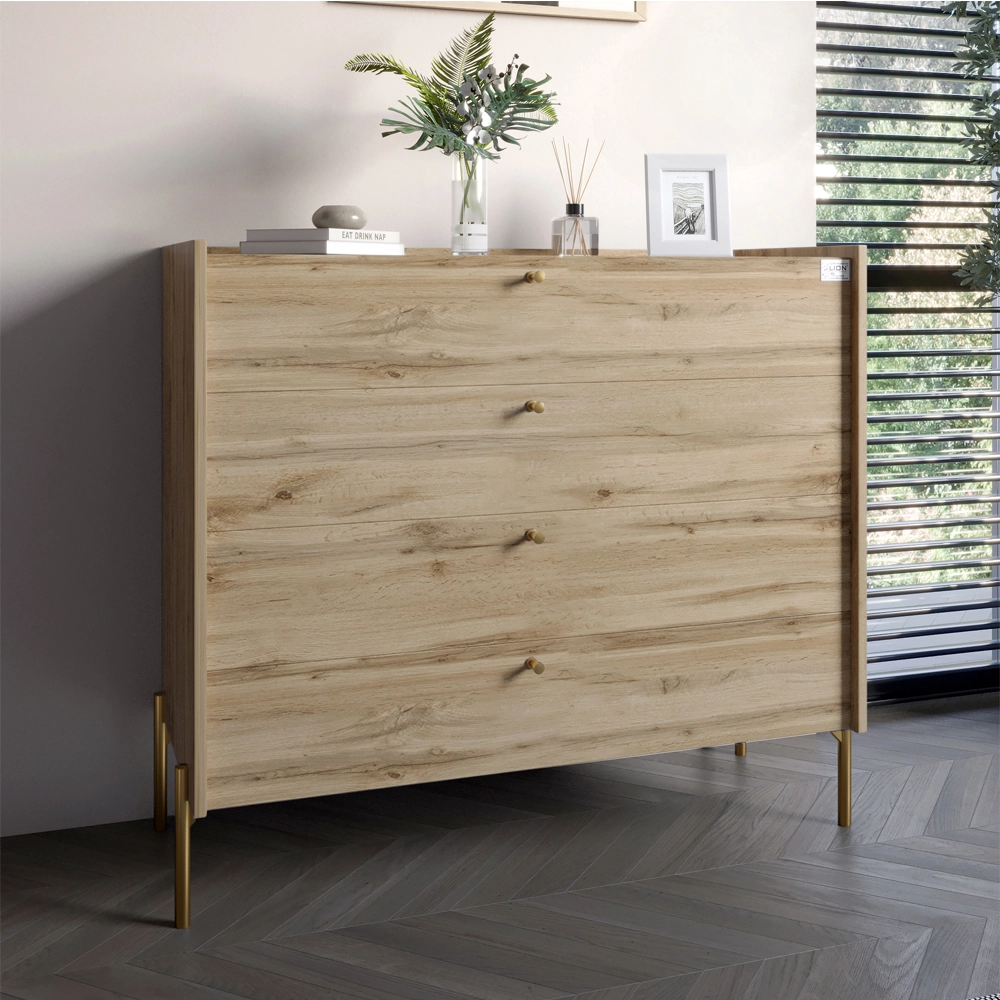 Вам нужен мебельный элемент, сочетающий в себе элегантность и функциональность? Комод LION Wood с 4 ящиками станет идеальным решением для вашего дома. Его современный дизайн и стильные золотые ножки не только придадут шарму вашему интерьеру, но и обеспечат удобный доступ к вашим вещам. Изготовленный из высококачественных материалов, этот комод отличается своей надежностью и долговечностью. Дуб Аппалачи придает ему естественный вид, а продуманное расположение ящиков позволяет удобно организовать пространство. Забудьте о беспорядке — теперь все ваши вещи будут под рукой!
