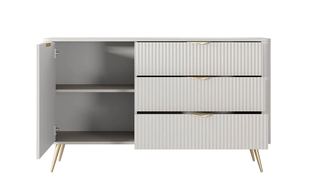 - Матеріали: Корпус комода виконаний з ламінованої ДСП товщиною 16 мм, що забезпечує стійкість та довговічність. Фасади виготовлені з МДФ товщиною 18 мм з фактурною поверхнею, а заокруглені кути з МДФ надають безпеки і естетичного вигляду.