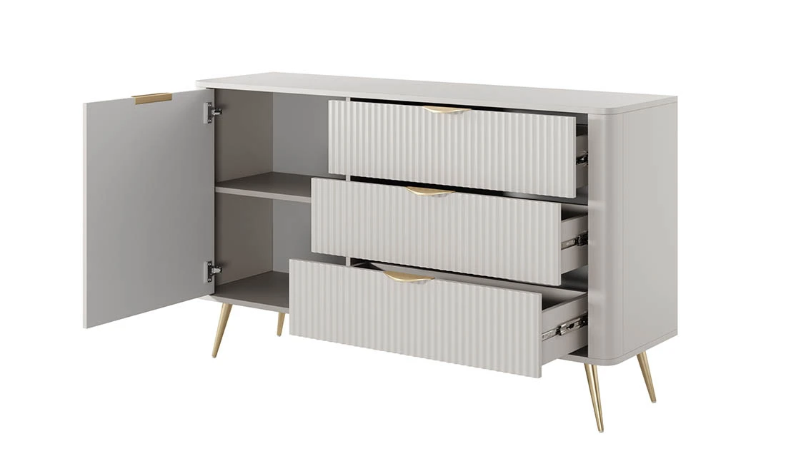 - Механізм відкриття шухляд: Комод оснащений телескопічними направляючими відкриття шухляд, які забезпечують повне висування та легкий доступ до зберіганого.