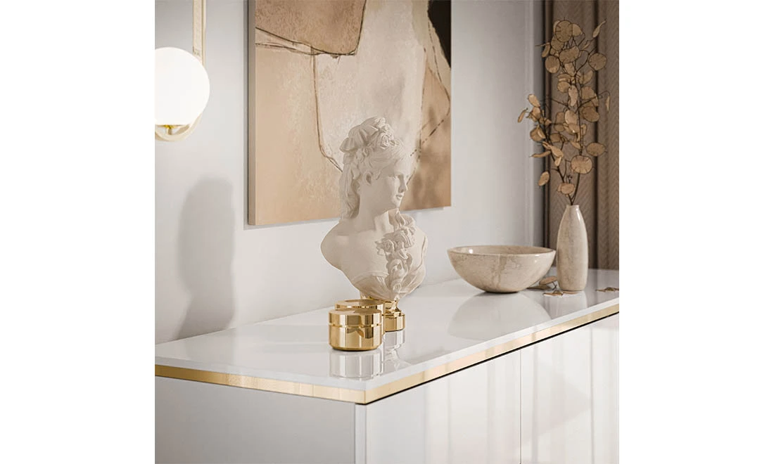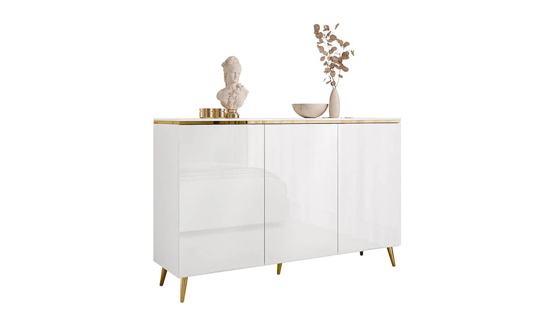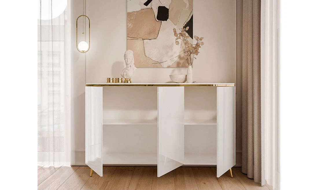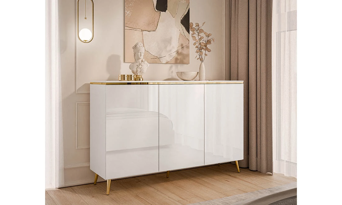Комод Моніка – стильний вибір для сучасного інтер’єру. Виготовлений у білому кольорі з глянцевими фасадами та стільницею, він надає приміщенню елегантного вигляду, а золотисті металеві ніжки додають нотку розкоші.