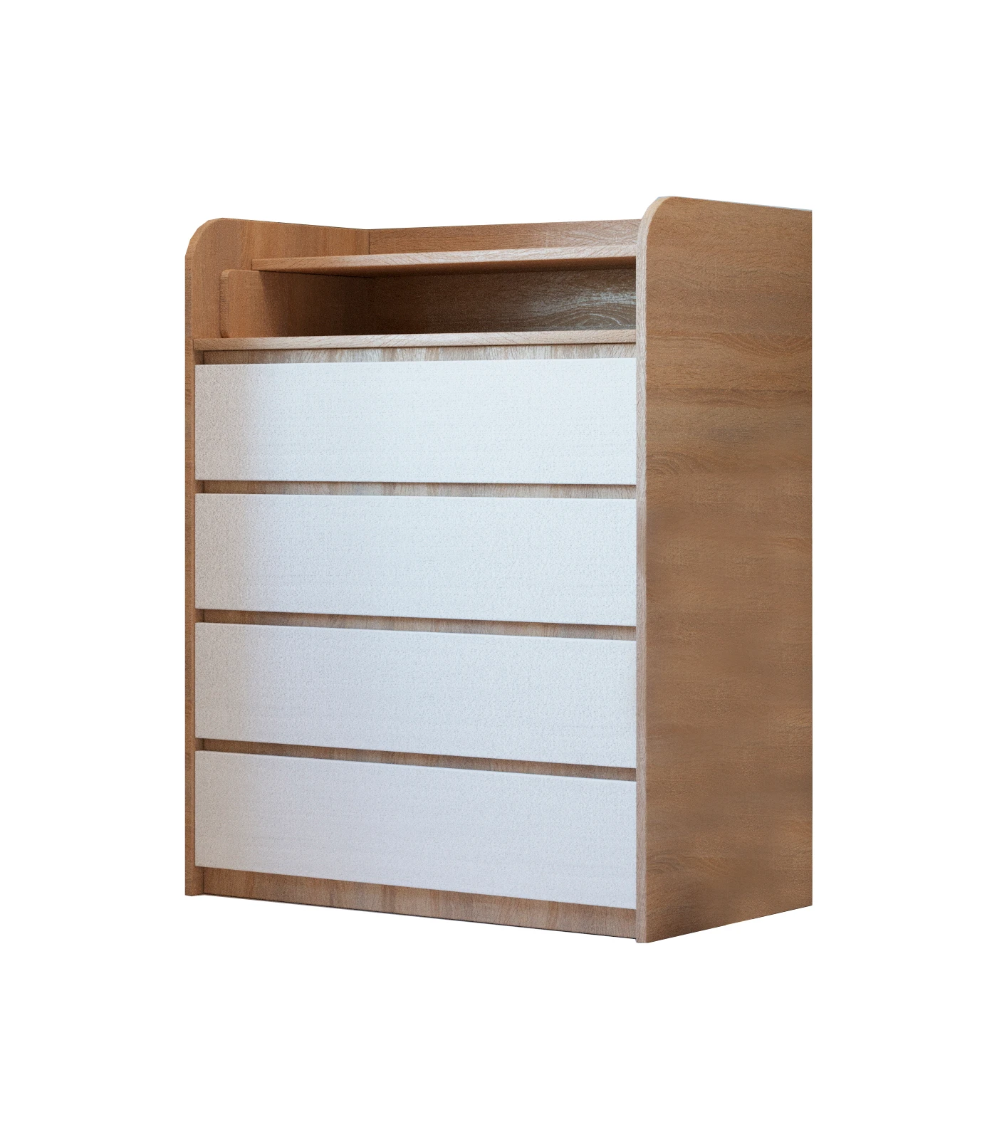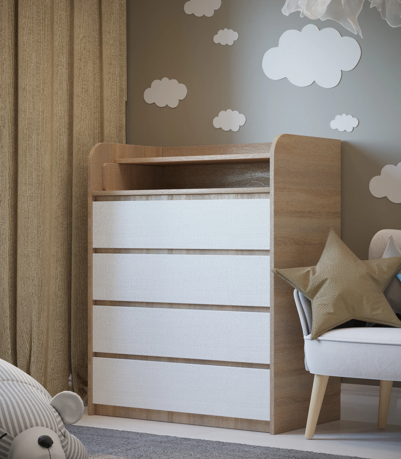 Шукаєте стильний і функціональний комод для пеленання? Комод пеленальний Еверест стане ідеальним доповненням до інтер'єру вашої дитячої кімнати. Завдяки своїм елегантним лініям та сучасному дизайну в кольорах сонома і білий, він не лише виглядає привабливо, але й забезпечує зручність у використанні. Телескопічні направляючі гарантують легкість відкривання ящиків, що робить процес догляду за малюком ще комфортнішим.