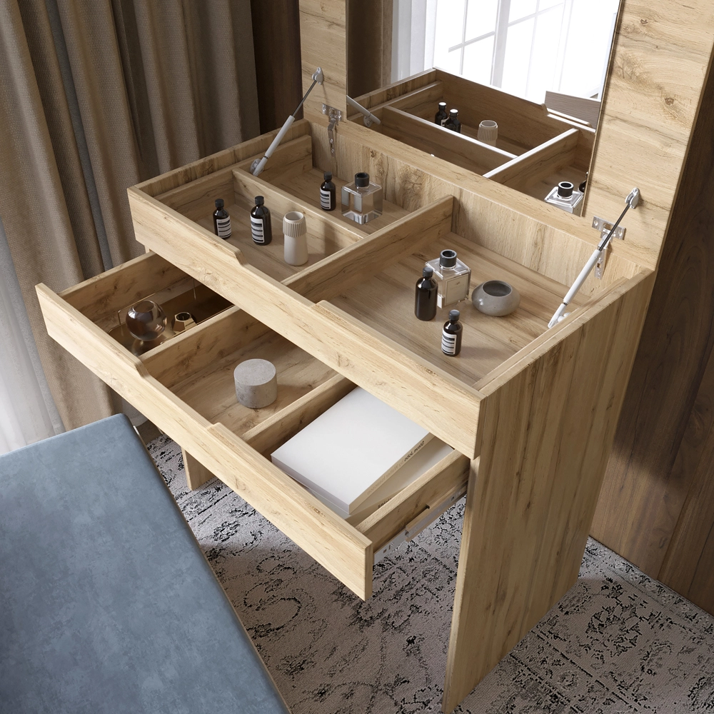 Комод-трюмо оснащен зеркалом, которое не только дополняет его эстетичный вид, но и дает возможность ежедневного использования. Вы сможете быстро подготовиться к работе или выходу, наслаждаясь безупречным отображением. Зеркало оптимального размера дарит возможность оценить свой образ со всех сторон.
