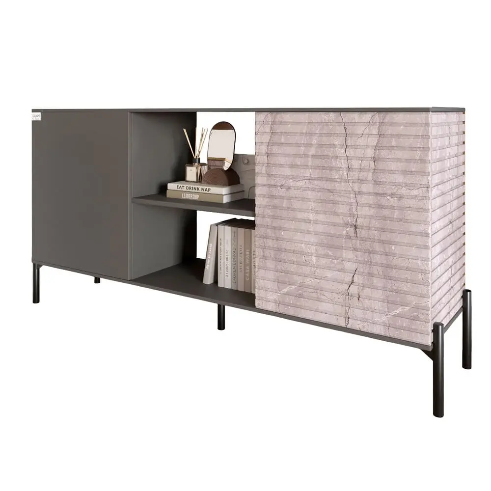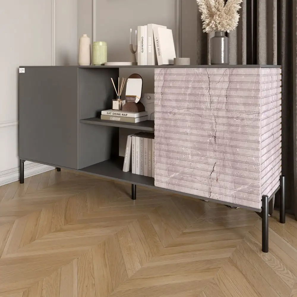 Открытый комод LION в цвете Грей Антрацит с элементами Камня – это идеальное решение для тех, кто ценит современный дизайн и функциональность. Его черные металлические ножки придают мебели элегантность и стойкость, а открытые полочки создают возможность для удобного хранения и демонстрации ваших любимых вещей. Добавьте нотку стиля в ваш дом с этим уникальным комодом!