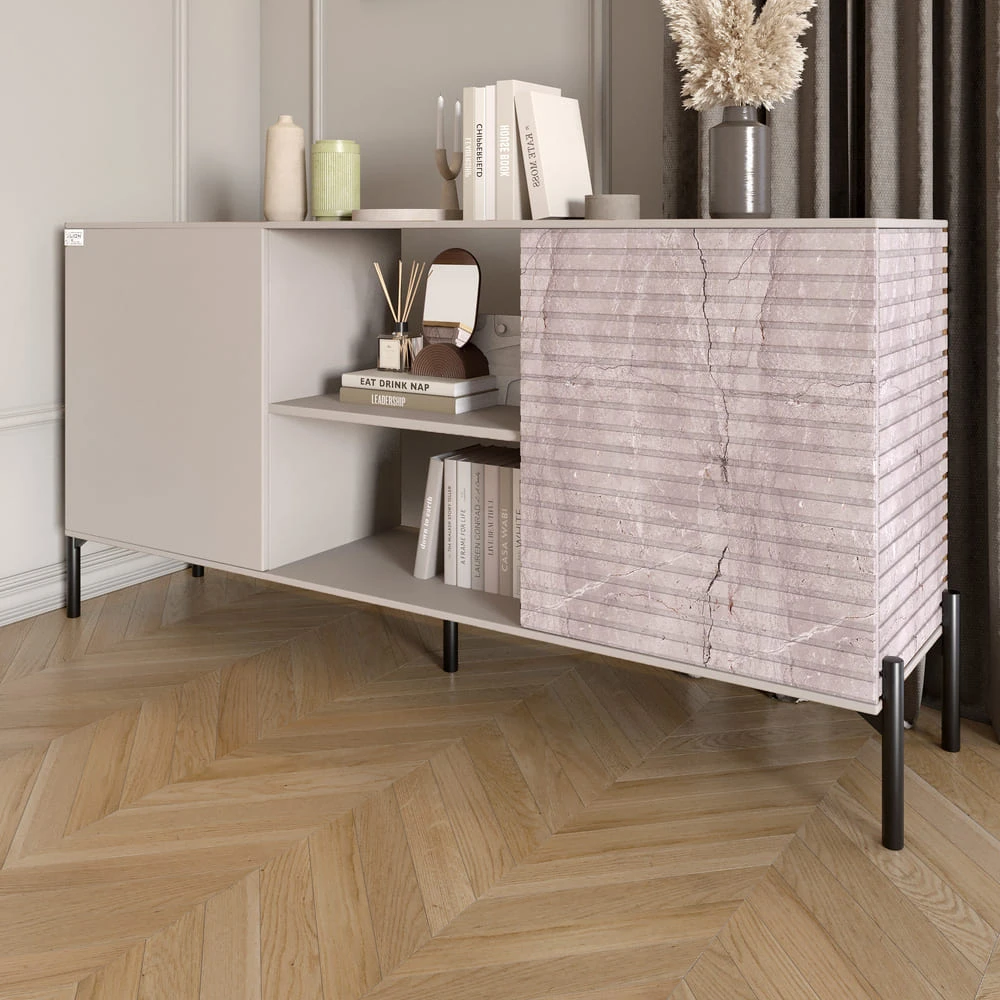 Комод из коллекции Грей – это идеальное решение для современного интерьера, сочетающее в себе элегантность и практичность. Изготовленный из высококачественного ЛДСП SWISS KRONO, он не только радует глаз своим гладким фасадом с текстурными акцентами, но и обеспечивает надежность и долговечность. Металлические ножки придают конструкции легкости, а также обеспечивают стабильность, что делает его отличным выбором для любой комнаты – от спальни до рабочего кабинета.
