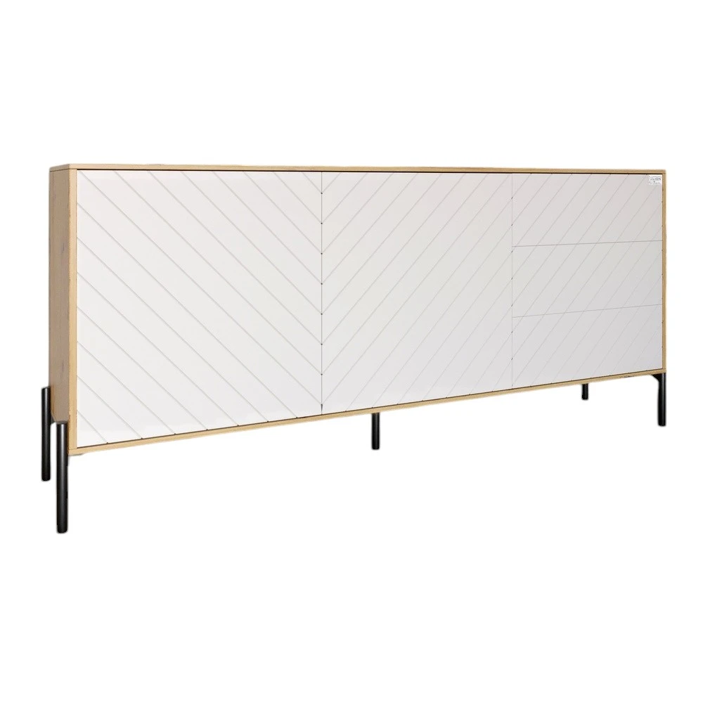 Откройте для себя уникальный комод LION, который не только дополнит ваш интерьер, но и станет неотъемлемой частью вашей повседневной жизни. Благодаря элегантному дизайну и сочетанию цветов дуба Артизан и белого, этот комод выглядит современно и стильно. Черные металлические ножки придают ему изящество и придают стабильность.