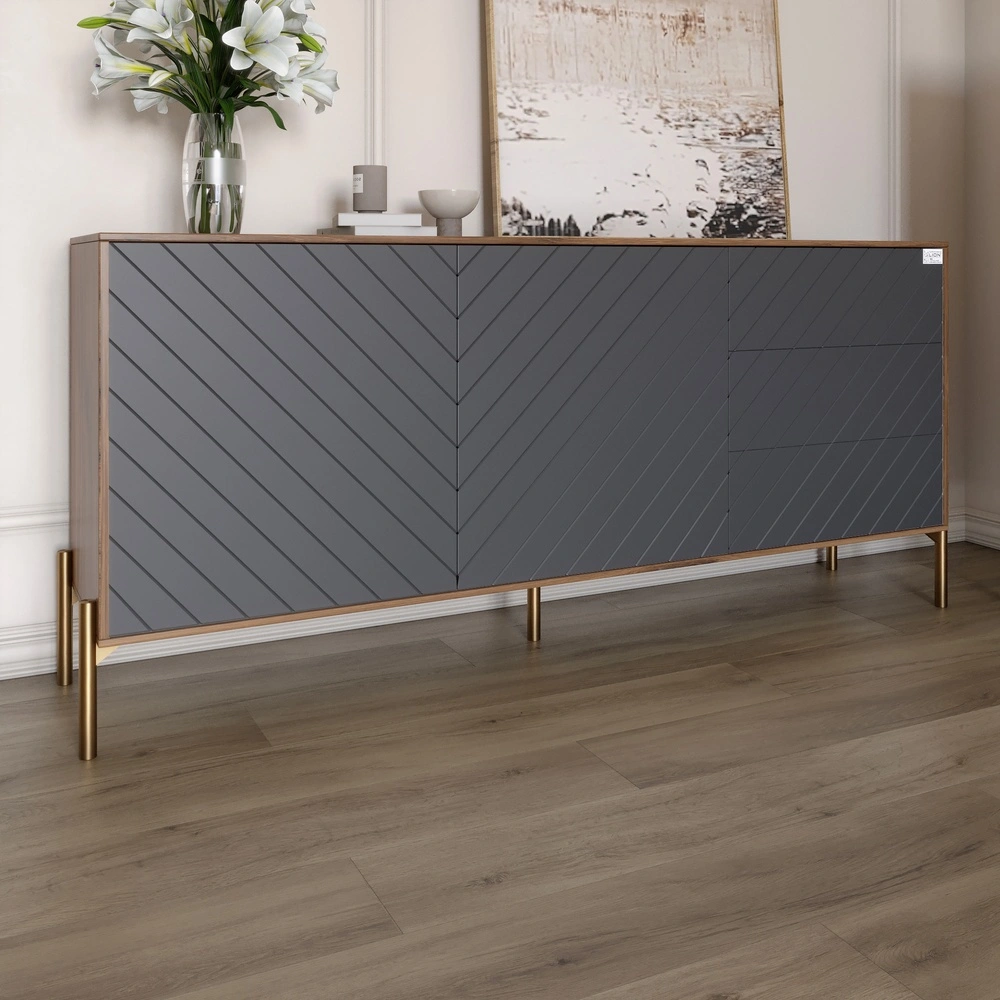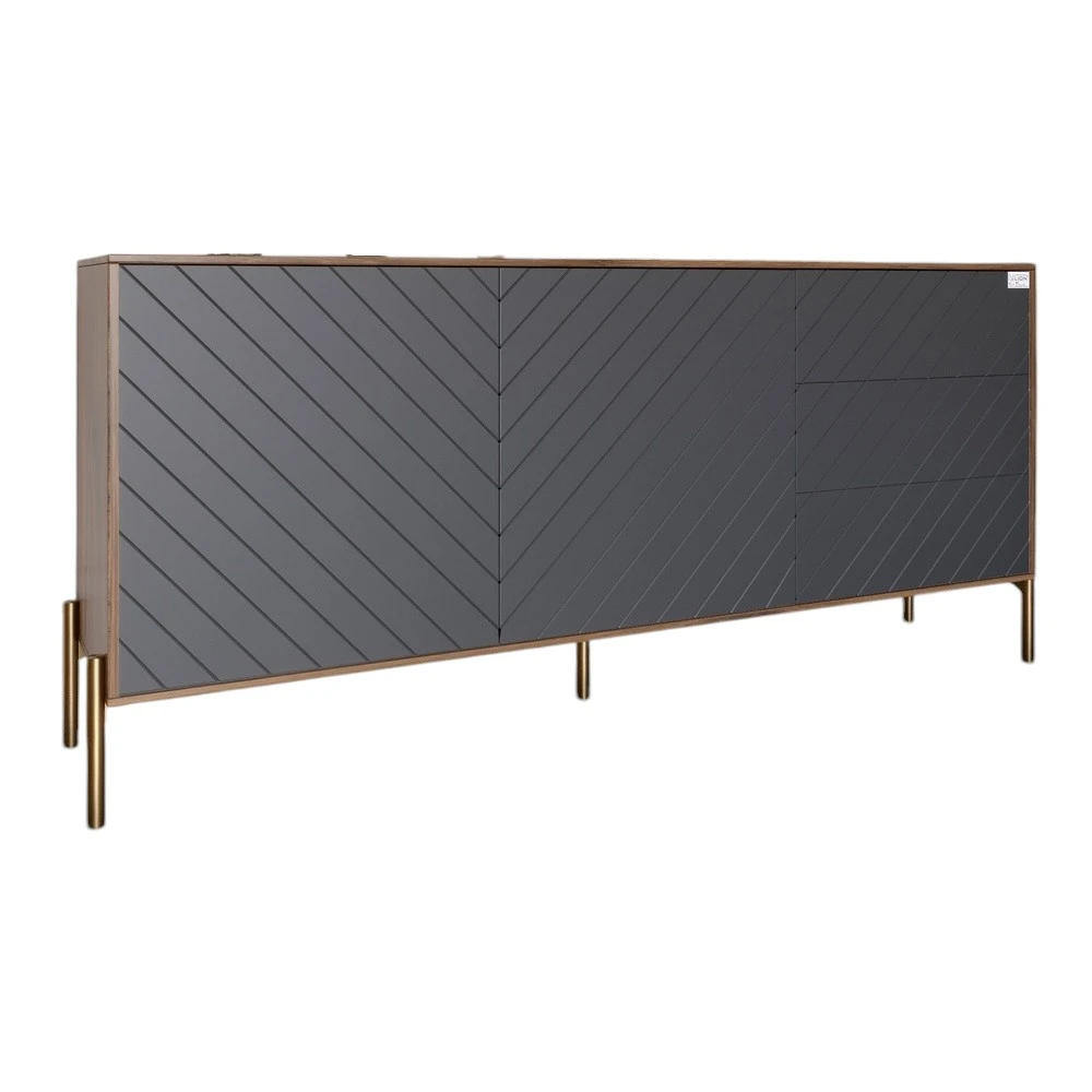 Откройте для себя идеальное сочетание стиля и функциональности с комодом LION. Его изысканный дизайн, сочетающий натуральный дуб Ливорно и графитовый оттенок, станет настоящим украшением любого интерьера. Золотые металлические ножки придают нотку роскоши и современности, подчеркивая ваш вкус и стиль.
