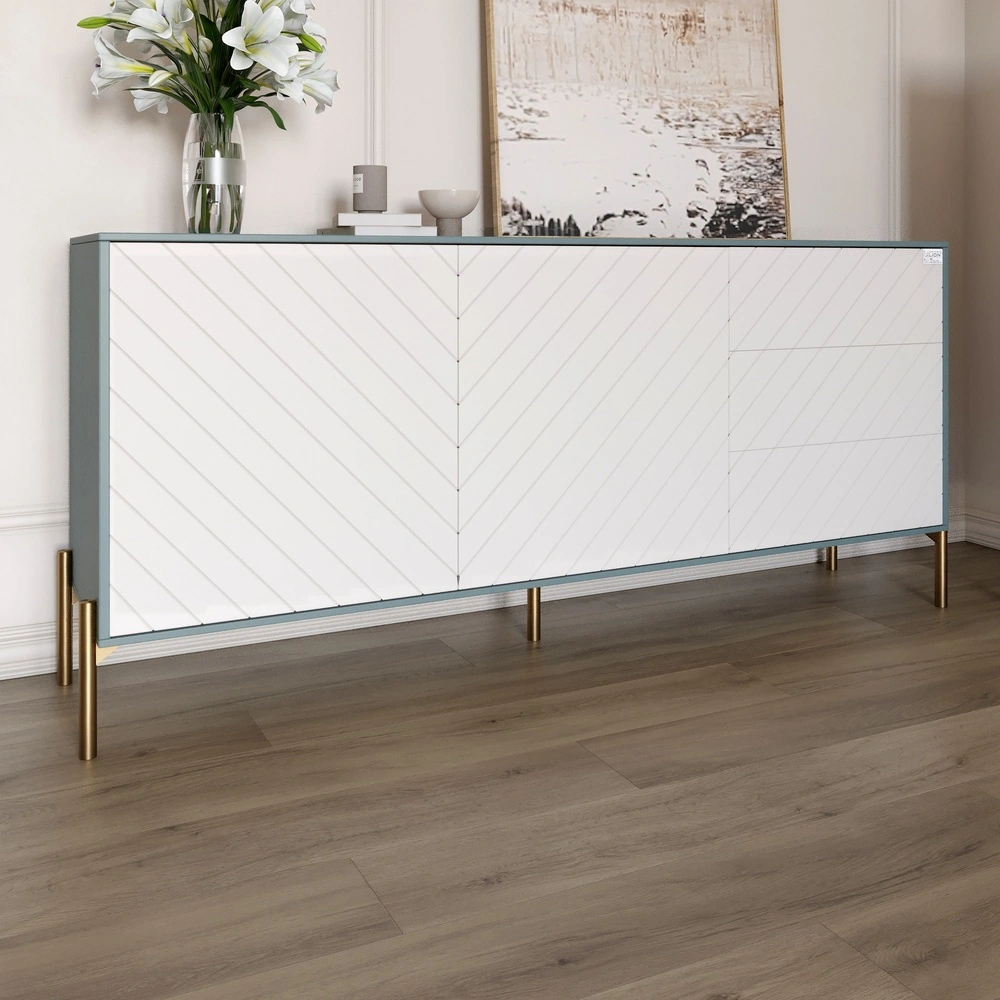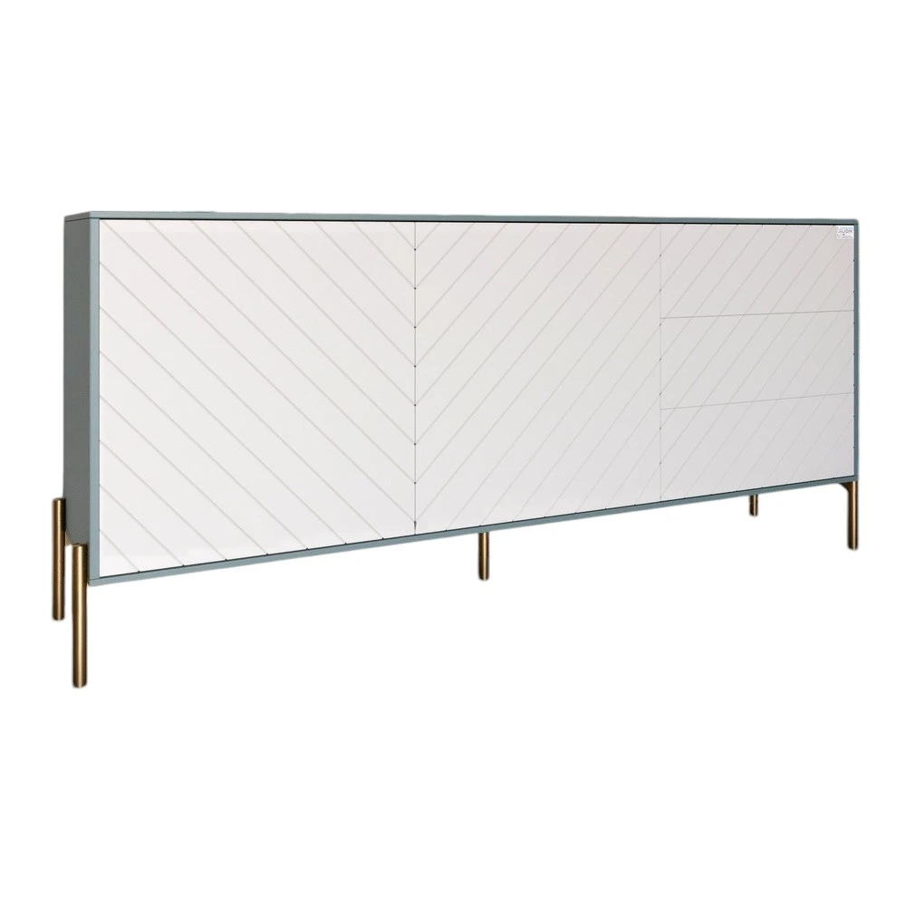 Благодаря своим компактным размерам 168x40x76,5 см, комод идеально подойдет для любой комнаты, от гостиной до спальни. Он обеспечивает достаточно места для хранения ваших вещей, при этом не занимая много пространства. Золотые металлические ножки придают ему стойкость и подчеркивают современный стиль, что делает комод не только практичным, но и стильным элементом вашего интерьера.