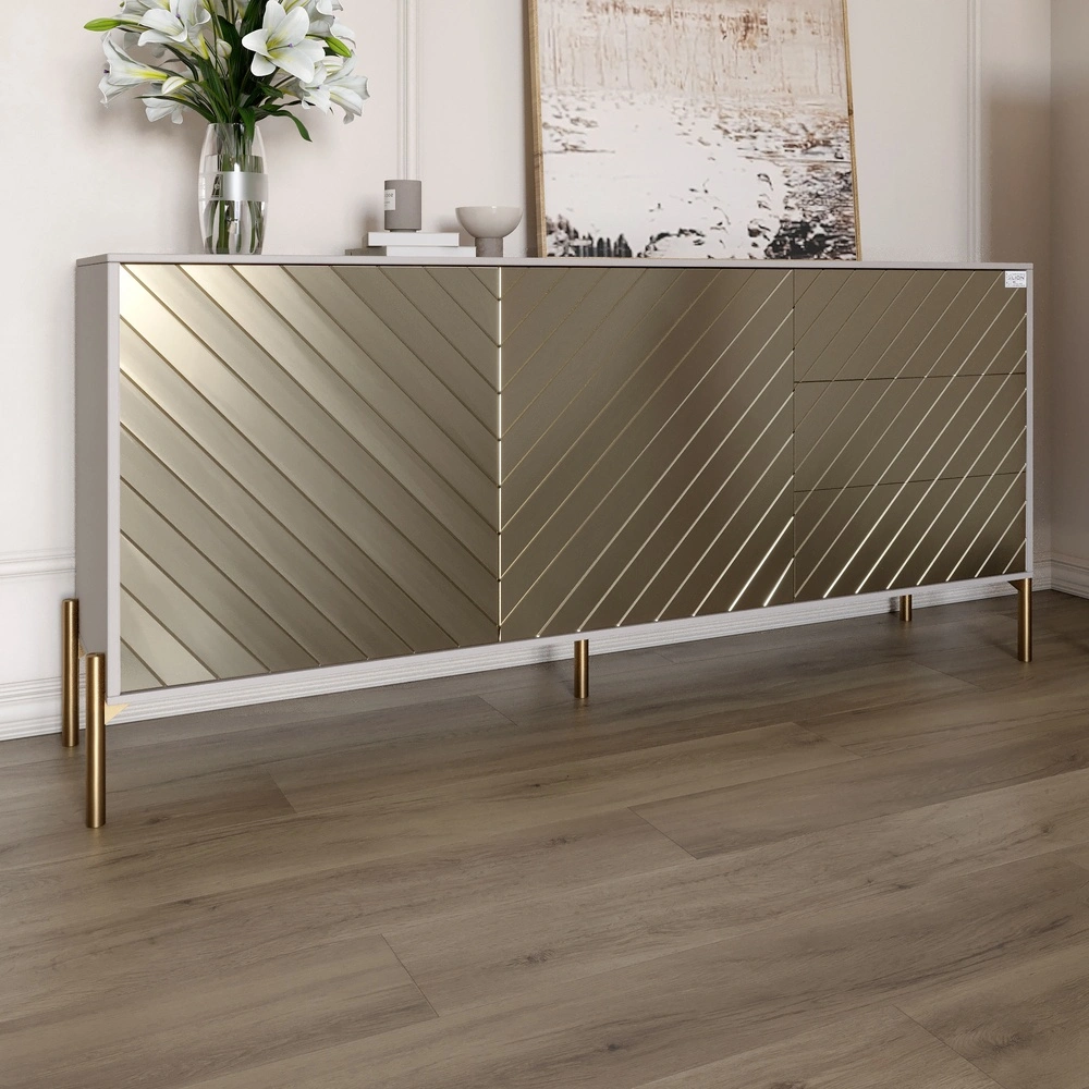 Создавайте элегантный и стильный интерьер с комодом LION. Его современный дизайн с кашемировой поверхностью и перламутровым металликом привлекает внимание и придает нотку роскоши любому помещению. Золотые металлические ножки не только подчеркивают стиль, но и обеспечивают надежность и стабильность конструкции.