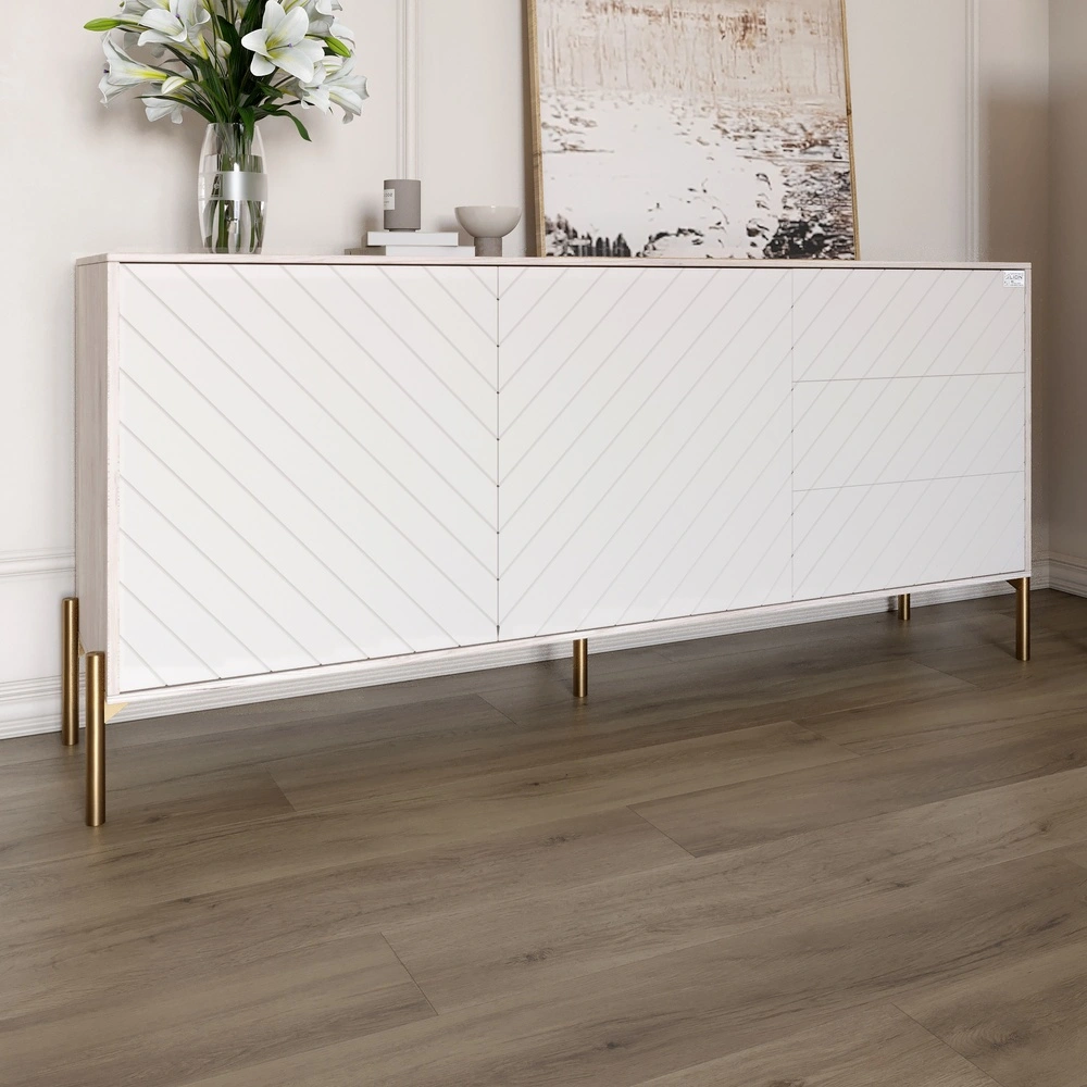 Благодаря своим золотым металлическим ножкам, этот комод не только выглядит изящно, но и обеспечивает стабильность и надежность. Его компактные размеры 168x40x76,5 см позволяют разместить его даже в ограниченных пространствах, при этом предоставляя достаточно места для хранения ваших вещей.