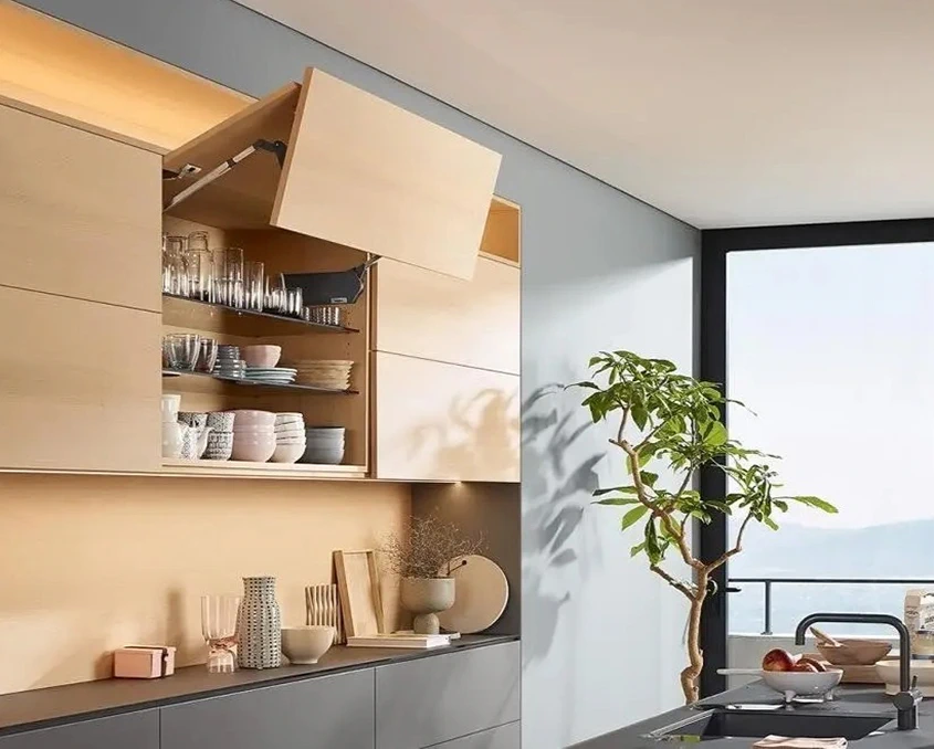 Aventos HF подходит для фасадов разного стиля - из древесины, стекла или их комбинаций. Механизм не нарушает внешнего вида мебели, ведь система крепится скрыто, сохраняя эстетику интерьера. Также предусмотрена интеграция с электрической системой Servo-Drive, которая обеспечивает автоматическое открывание дверцы легким нажатием - идеальное решение для современных кухонь, где функциональность сочетается с комфортом.