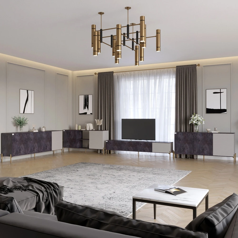 Откройте для себя идеальное сочетание стиля и функциональности с комплектом мебели для гостеприимной LION Грей. Этот модульный комплект включает в себя комод, открытый и закрытый комод, а также тумбу для ТВ, что позволяет адаптировать мебель под ваш интерьер. Металлические золотые ножки не только придают современный вид, но и гарантируют устойчивость конструкции, а рельефные детали на фасаде привносят динамику и оригинальность в ваше пространство. Изготовлен из высококачественного ЛДСП SWISS KRONO, этот комплект мебели устойчив к механическим повреждениям, влаге и высоким. Минималистичные элементы дизайна, такие как отсутствие наружных ручек и 2 мм кромка, придают изделиям элегантный вид, подчеркивая их современность. Сделайте свой дом более уютным и стильным с комплектом LION Грей — идеальным выбором для интерьеров в стиле минимализм, лофт или модерн.
