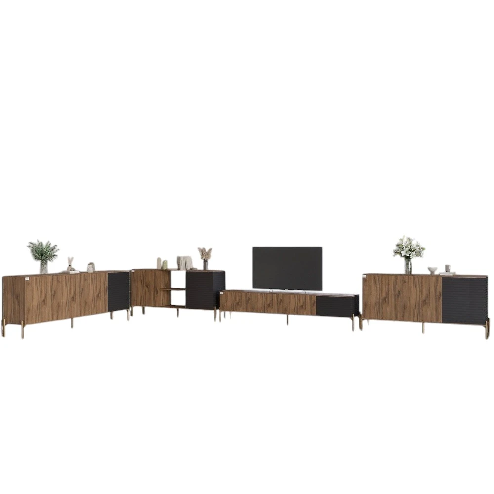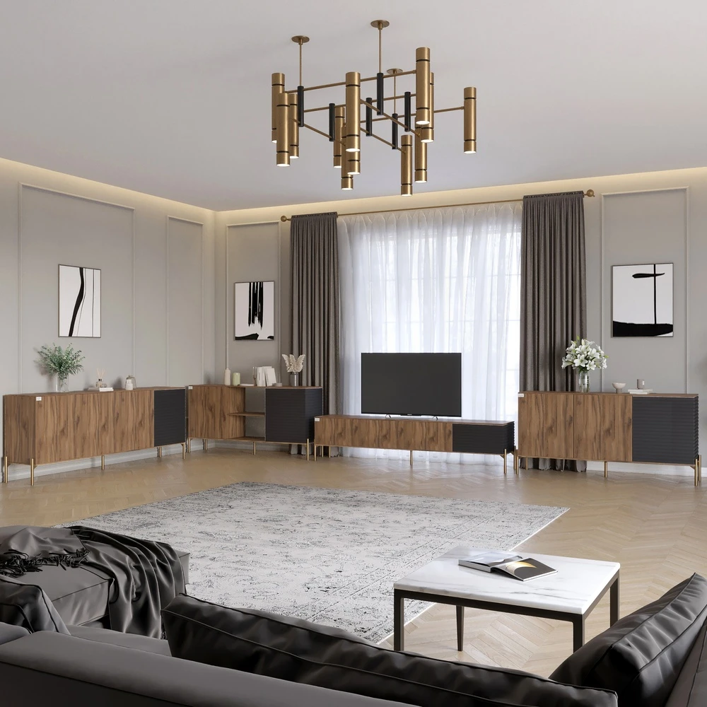 Превратите вашу гостиную в стильное и функциональное пространство с комплектом модульной мебели LION Грей. Этот комплект, состоящий из комода, открытого и закрытого комода, а также тумбы для ТВ, сочетает в себе элегантный дизайн и высокую практичность. Металлические золотые ножки не только придают современный вид, но и обеспечивают стабильность, а рельефные детали на фасадах создают динамичный акцент в вашем интерьере. Мебель идеально впишется в стиле минимализма, лофта или модерна, придавая вашему дому уникальности.
