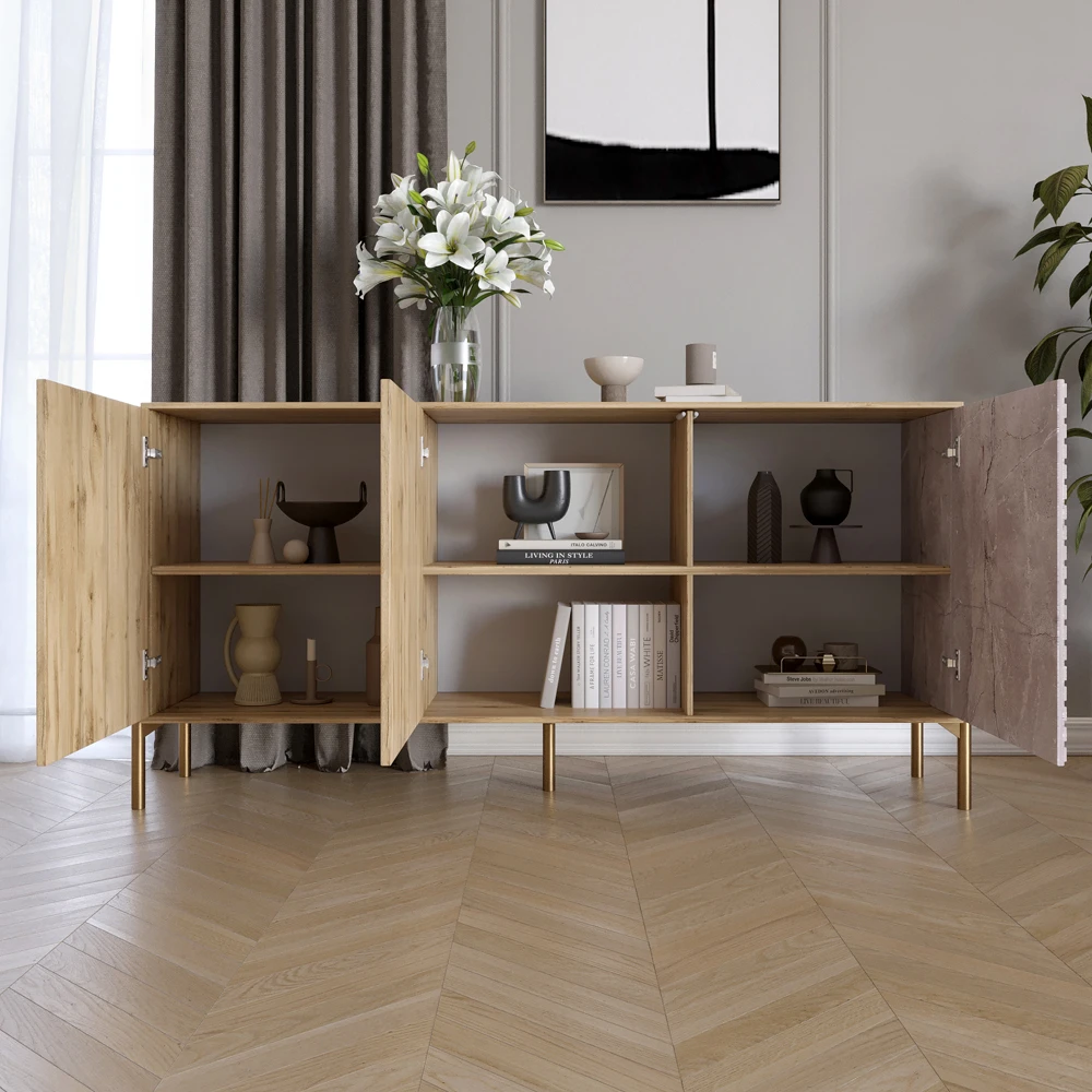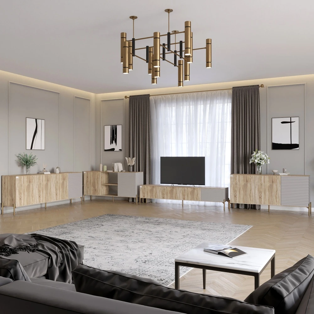 Комплект модульной мебели LION Грей станет идеальным решением для тех, кто ценит эстетику и комфорт. Его стильный дизайн с рельефными деталями на фасаде и современными золотыми металлическими ножками привносит элегантность в любой интерьер. Этот комплект включает комод, открытый и закрытый комоды, а также тумбу для телевизора, что делает его универсальным для различных стилей, таких как минимализм, лофт или модерн. Модульная структура позволяет легко комбинировать элементы по вашему желанию, адаптируя мебель к разным пространствам. Простые, безручковые фасады и кромка 2 мм повышают надежность и эстетичность изделий, а также упрощают уборку благодаря поднятию надежных ножек. Выберите LION Грей для создания уютной и современной атмосферы в вашем доме!