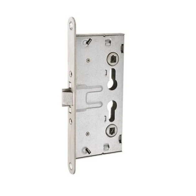 Корпус замка для противопожарных дверей предназначен для врезного монтажа в металлические двери с повышенными требованиями к огнестойкости. Изготовлен из стали с цинковым покрытием цвета «металлик», что обеспечивает защиту от коррозии и устойчивость к высоким температурам. Механизм имеет два отверстия под цилиндр, что позволяет устанавливать его в двери с правым или левым открыванием. Конструкция обеспечивает плотное прилегание дверного полотна и надёжное запирание даже при тепловых деформациях.