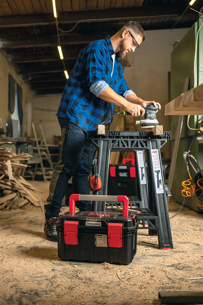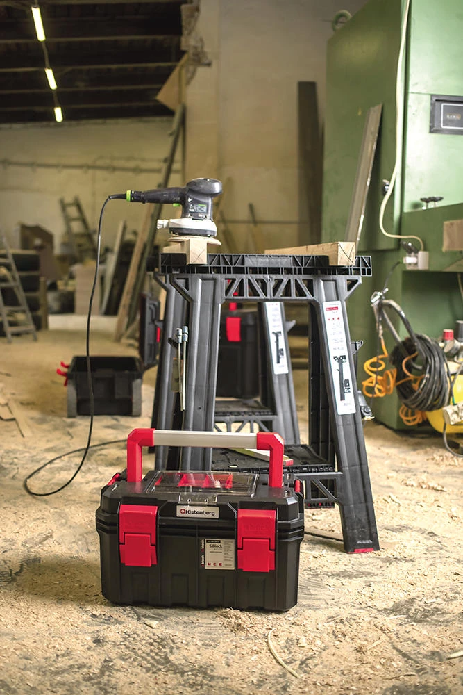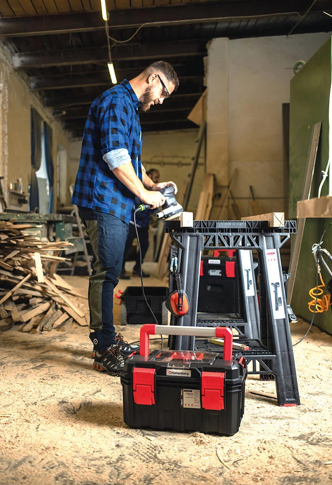 Будівельні козли TECH STAND характеризуються високою міцністю, малою вагою і практичними функціями. Вони мають вбудовані пази завширшки 5,2 см (2 дюйми) для різання матеріалів і спеціальне місце для кріплення столярних струбцин, що значно полегшує роботи по дереву. Додатково будівельні козли оснащені чотирма гачками і полицею для інструментів, що дає змогу під час роботи тримати необхідні інструменти під рукою. Кожні мають вантажопідйомність до 175 кг, що гарантує стійкість і безпеку під час використання.