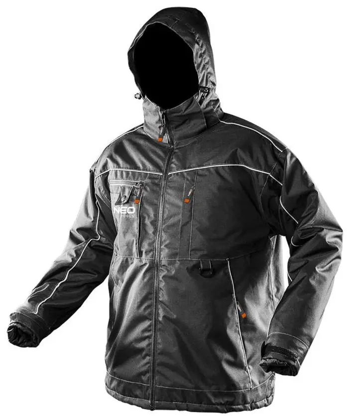 Робоча зимова куртка NEO TOOLS (арт. 81-570-XL) вітронепроникна і водонепроникна. Дуже тепла, і в той же час легка і міцна, завдяки використаним матеріалам. Не сковує рух. Має регульований капюшон, який знiмається, а також високий комiр, що захищає шию. Рукава з лаштунками з регульованими шнурами, є додаткові внутрішні манжети, що захищають від проникнення вітру або дощу. У нижній частині куртки знаходиться куліса з інтегрованими регульованими шнурами, що дозволяють зберігати тепло при максимальній експлуатації. Куртка має багато зручних кишень, в тому числі кишеню для смартфона, розмір якого збільшений в порівнянні з попередніми моделями. Завдяки внутрішньому кишені і багатофункціонального кріпленню, найнеобхідніші предмети можна завжди мати при собі. Світлоповертаючі елементи забезпечують краще візуальне позначення користувача. Гарантією якості є європейський сертифікат CE, а також виконання відповідно до вимог стандарту EN ISO 13688 діє до: 2013. Бренд NEO TOOLS виправдовує очікування професіоналів.